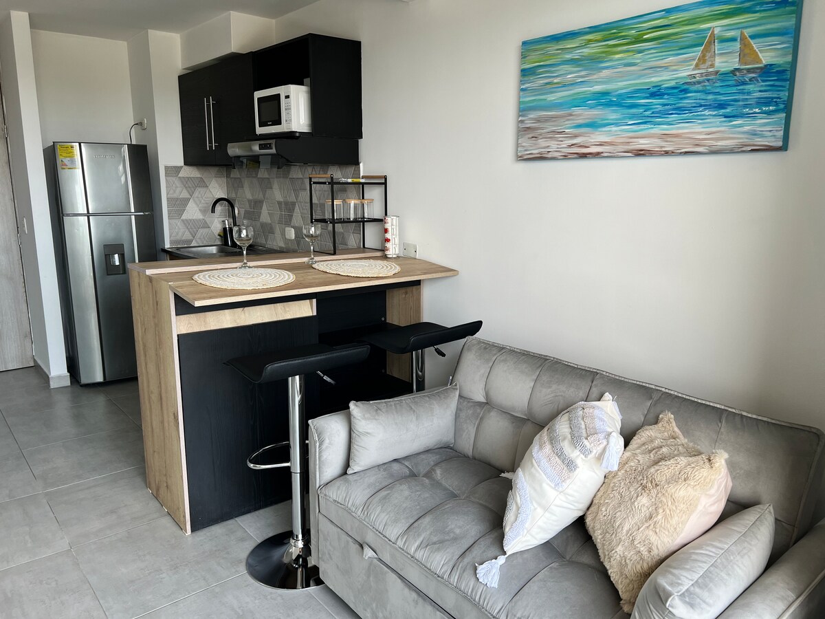 🌴 EXSTR APARTMENT • Hayedo 704 🏊🏽‍♂️ Brand-new studio on the 7th floor with huge balcony and amazing views of Cali. The apartment comes fully equipped with everything needed for great stay, including a high quality queen size bed, a fully stocked kitchen, safe, fast WiFi and a SmartTV. The Hayedo building was made for short term rentals and comes with all the top requested amenities such as 24/7 security, elevators, free parking, rooftop swimming pool, and a basic gym.