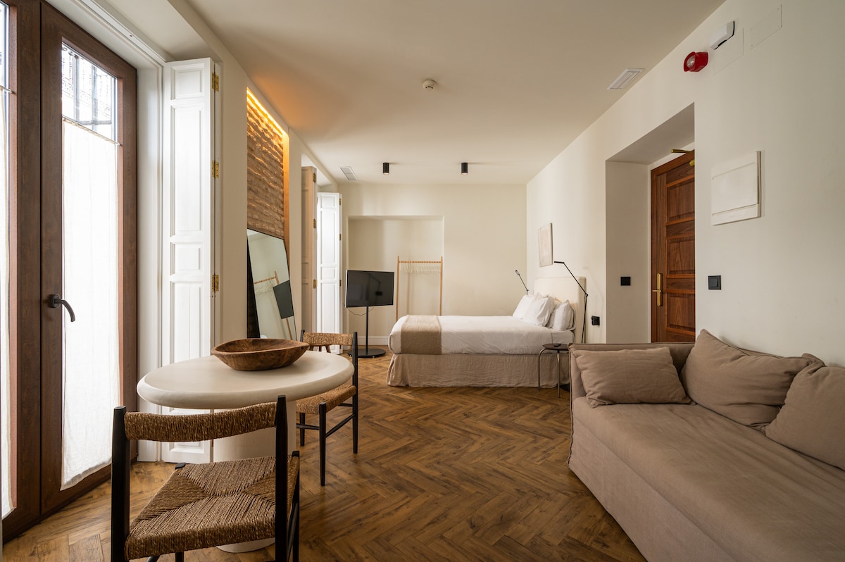 [MYLU SUITES by PUERTA CATEDRAL] Apartamento de un dormitorio ideal para familias con una ocupación máxima de 2 adultos + 1 niño de hasta 18 años. Baño privado abierto en el dormitorio. Ubicado en nuestro edificio MYLU SUITES by PUERTA CATEDRAL, un entorno privilegiado en pleno corazón de Sevilla. A pocos metros de la Catedral y del Real Alcázar, los dos monumentos mas visitados de la ciudad. Terraza de uso común en el edificio con piscina.