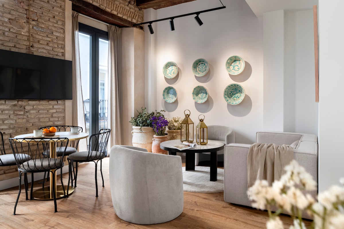 Beautifully restored townhouse converted into a modern vacation rental celebrates the old building structure with warm modern interiors and a touch of industrial style. Floor-to-ceiling, French windows look out over traditional balconies on to the charming street below. Sunlight floods the open plan space, casting light on exposed sandstone walls and illuminating the stunning oak beam ceilings. The shared top floor terrace offers incredible views to the Cathedral roof and the Giralda.