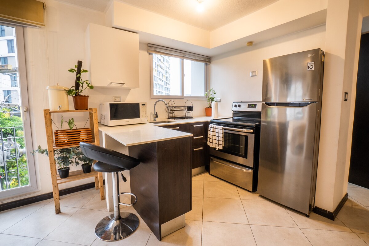 Apartamento entero y moderno. Cuenta con 2 balcones, 1 habitación con cama Queen y baño privado, sala con sofá cama, comedor, cocina totalmente equipada, lavadora y secadora de ropa. Con 2 smart TV de 42” para entretenimiento y wifi . Incluye 1 parqueo gratuito en las instalaciones. **El edificio cuenta con Supermercado y restaurantes**