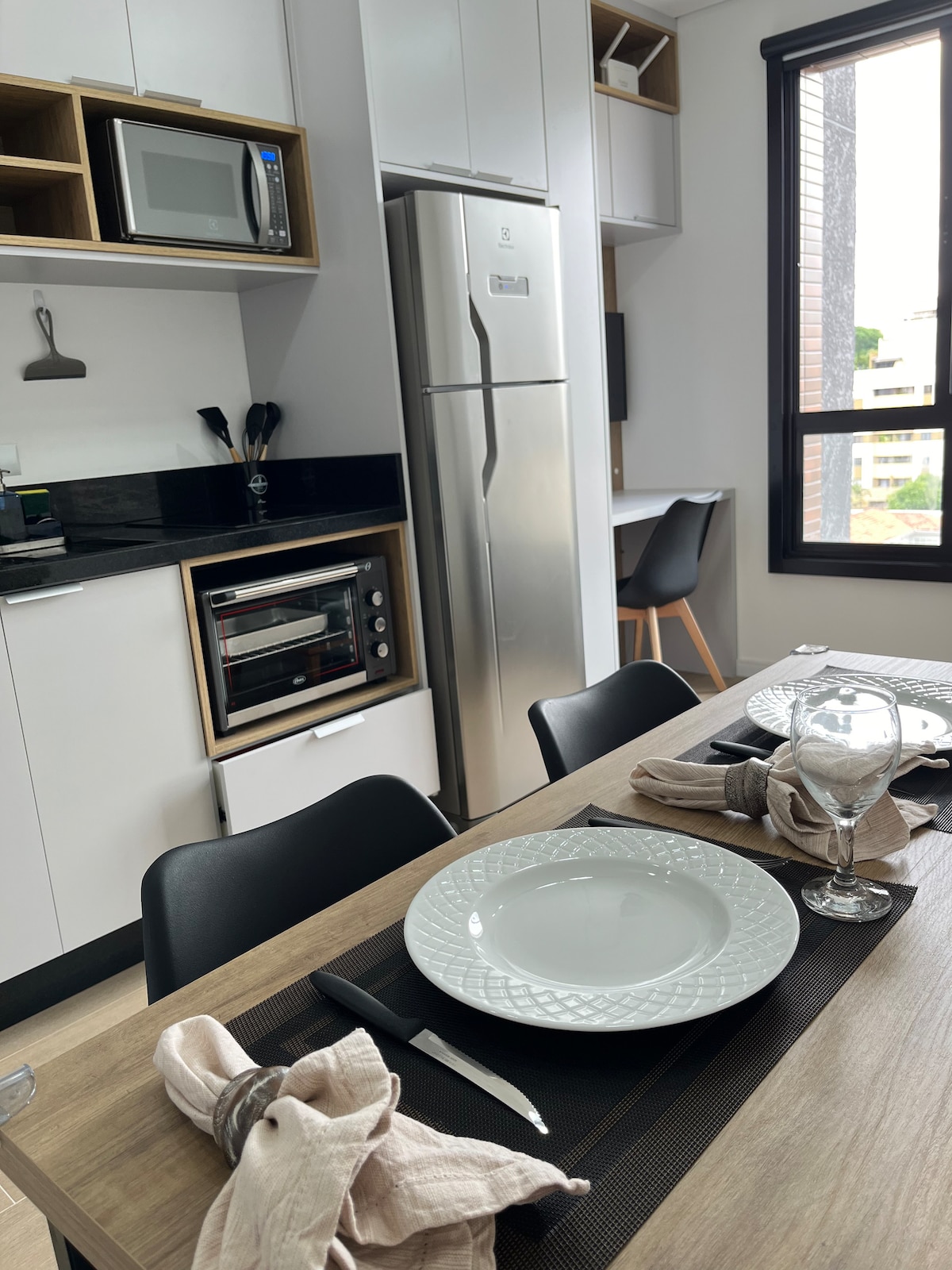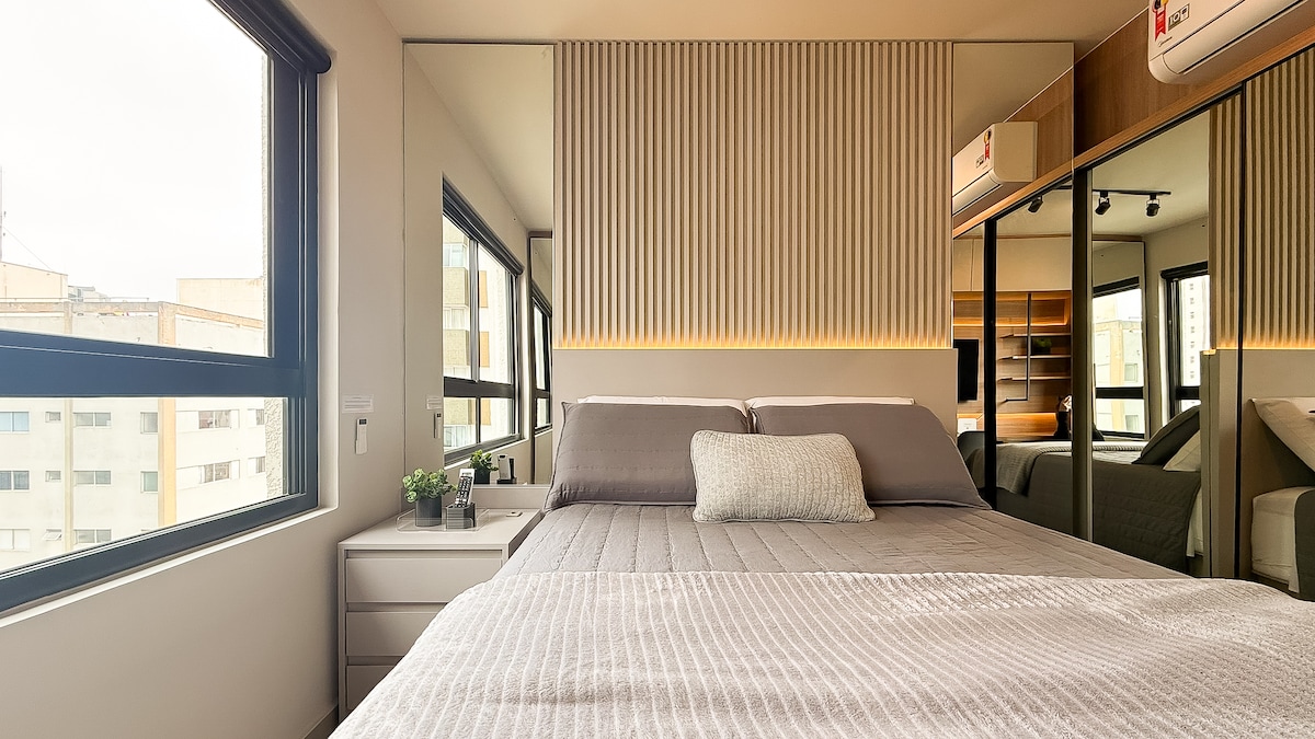 Studio moderno, novíssimo, aconchegante, perfeita localização, com uma linda vista da sacada, principalmente a noite . Wi-Fi rápido, mesa de trabalho, TV smart 55” , cama Queen. Ar condicionado (quente/frio). Máquina de lavar e secar roupa e uma linda ilha na cozinha. 50m2 de muito estilo-27ºandar, Silencioso. No Centro/Batel, próximo à comércios, bancos, shoppings, polo gastronômico e Hospital . No prédio :Piscina, academia, sala de jogos, sauna, jacuzzi, portaria 24 horas.