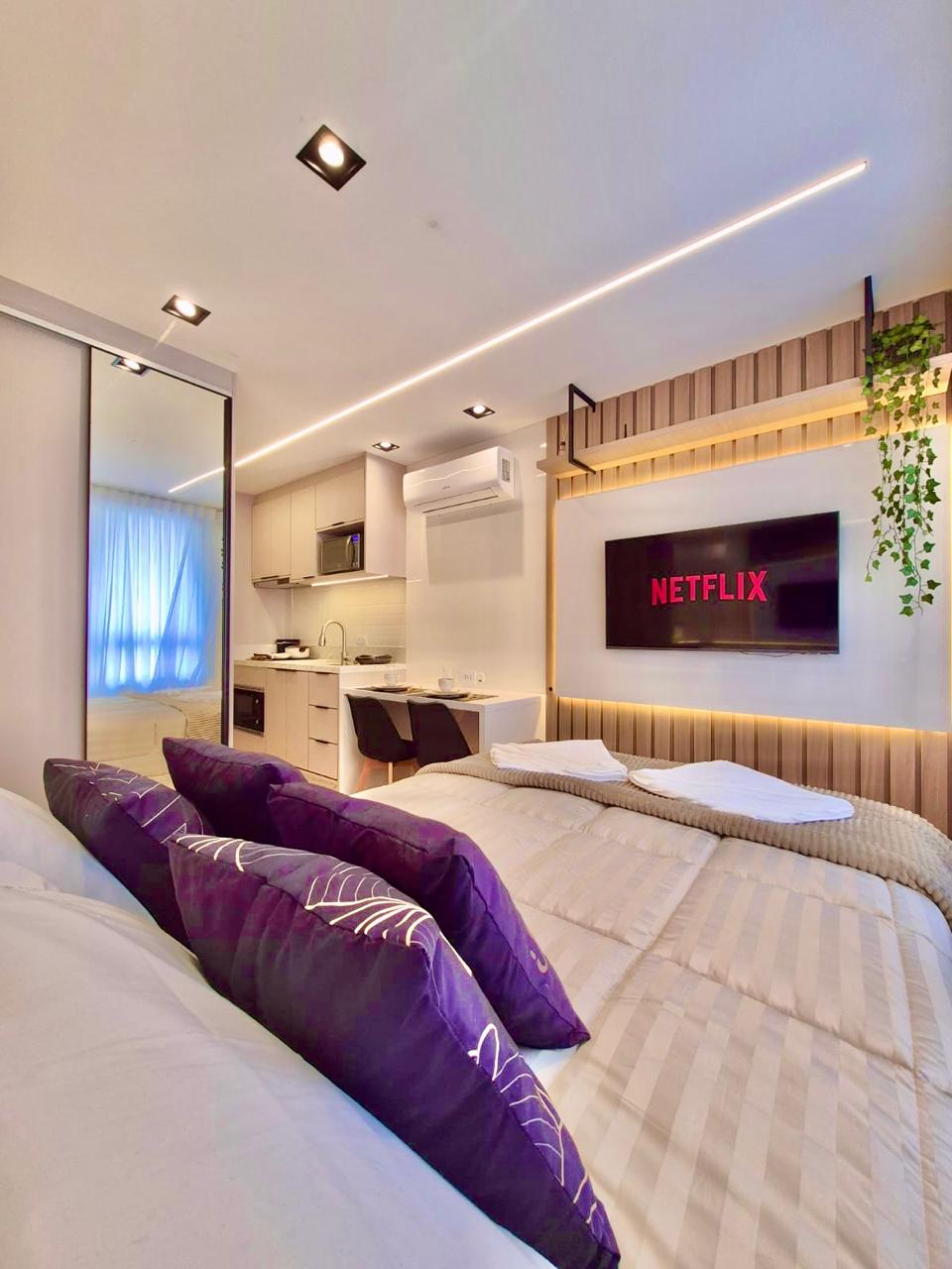 Studio de luxo completo no 29º andar, TV Smart grande, WI-FI, NET, ar condicionado, garagem coberta, piscina, academia, espaço kids, espaço para yoga/pilates, quadra de esportes, mirante, sala de sinuca, lavanderia, espaço de coworking, sala de estudo, mercearia e mercado, tudo isso dentro do edifício ao lado do Shopping Estação e de fácil acesso aos principais pontos turísticos de Curitiba. É ideal para casal, mas pode acomodar mais 2 pessoas no sofá-cama. Perfeito para aquele momento especial!