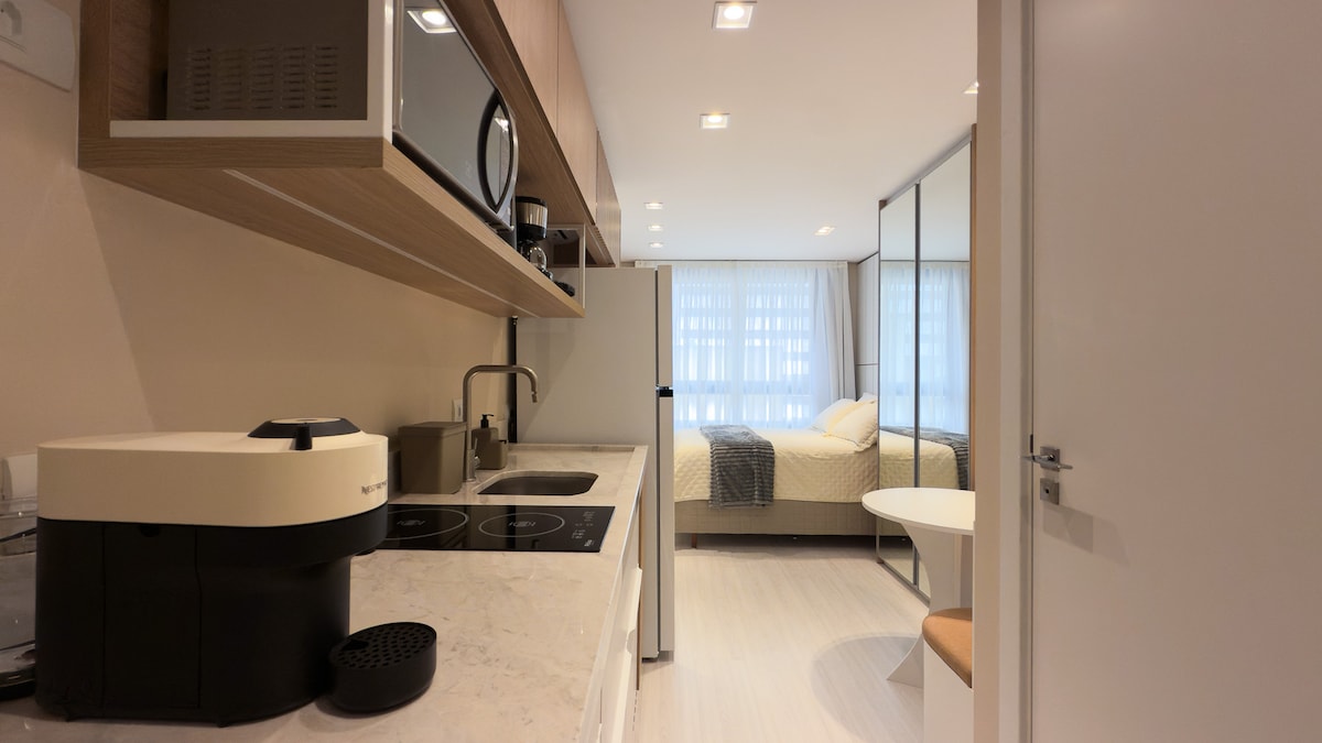 O lindo Studio Riachuelo XV de Novembro do AirB&B dos Favoritos é perfeita para um casal ou até 4 adultos curtirem Curitiba no coração da cidade. Ambiente integrado do studio conta com cozinha totalmente equipada, Smart TV HD e banheiro com ducha de alta pressão para uma experiência inesquecível!