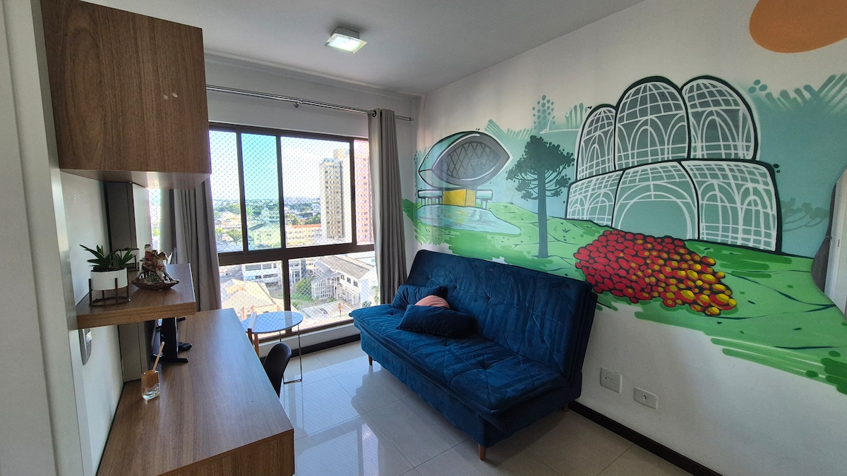Modern studio condo in Rebouças, 5 min from Mercado Municipal, Shopping Estação, and near cafés and bars. Easy access: 10 min to the bus station, 25 min to the airport. AC + heating; gas water shower; co-working; 400 Mb Wi‑Fi + desk; queen bed with hotel‑style linens + blackout shades; equipped kitchen; smart TV streaming; 24 h self check‑in; laundry & gym in the building.
