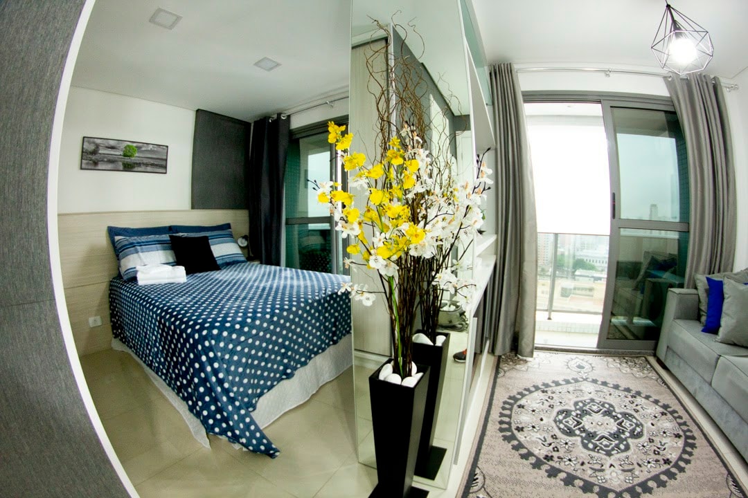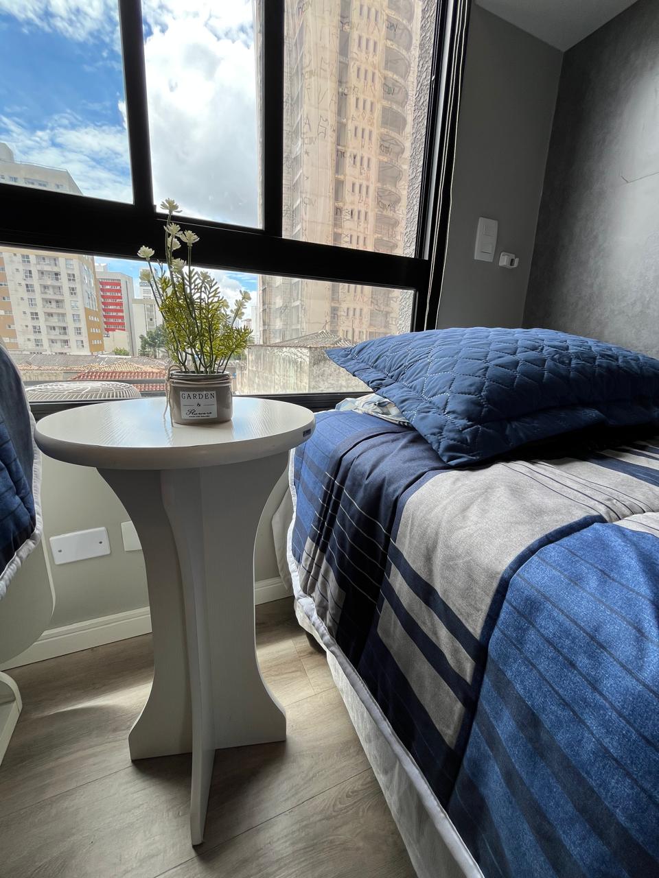 Modern studio condo in Rebouças, 5 min from Mercado Municipal, Shopping Estação, and near cafés and bars. Easy access: 10 min to the bus station, 25 min to the airport. AC + heating; gas water shower; co-working; 400 Mb Wi‑Fi + desk; queen bed with hotel‑style linens + blackout shades; equipped kitchen; smart TV streaming; 24 h self check‑in; laundry & gym in the building.