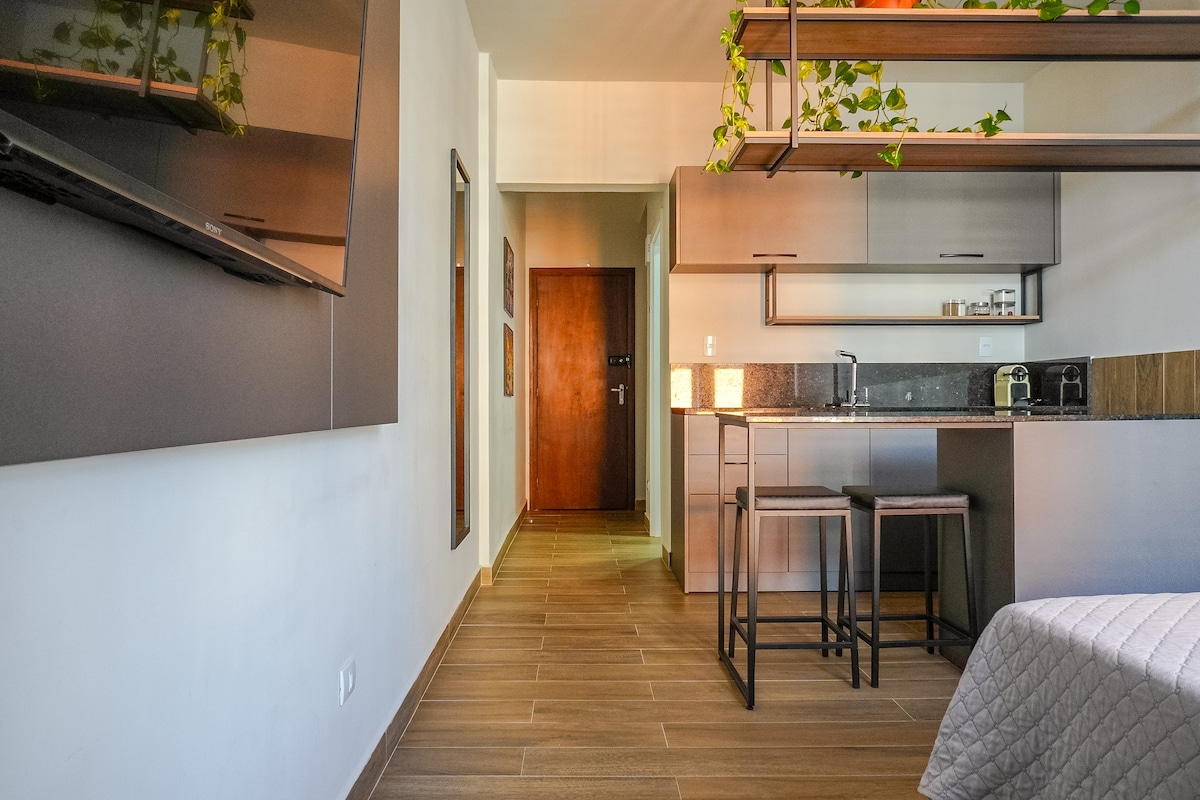 Modern studio condo in Rebouças, 5 min from Mercado Municipal, Shopping Estação, and near cafés and bars. Easy access: 10 min to the bus station, 25 min to the airport. AC + heating; gas water shower; co-working; 400 Mb Wi‑Fi + desk; queen bed with hotel‑style linens + blackout shades; equipped kitchen; smart TV streaming; 24 h self check‑in; laundry & gym in the building.