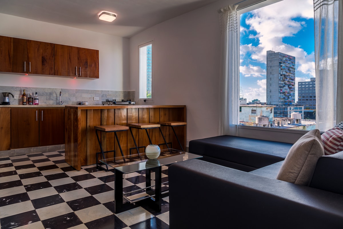 2022 remodeled apartment located in downtown Havana. Air conditioned, excellent location and views, free wi-fi and personal service. Best quality bed sheets, bathrobes, white towels, bottled water and room service included. At the apartment, you will find all you need for a pleasant stay in Havana. Your hosts can be reached 24-hours a day through and you will have a telephone for national calls.