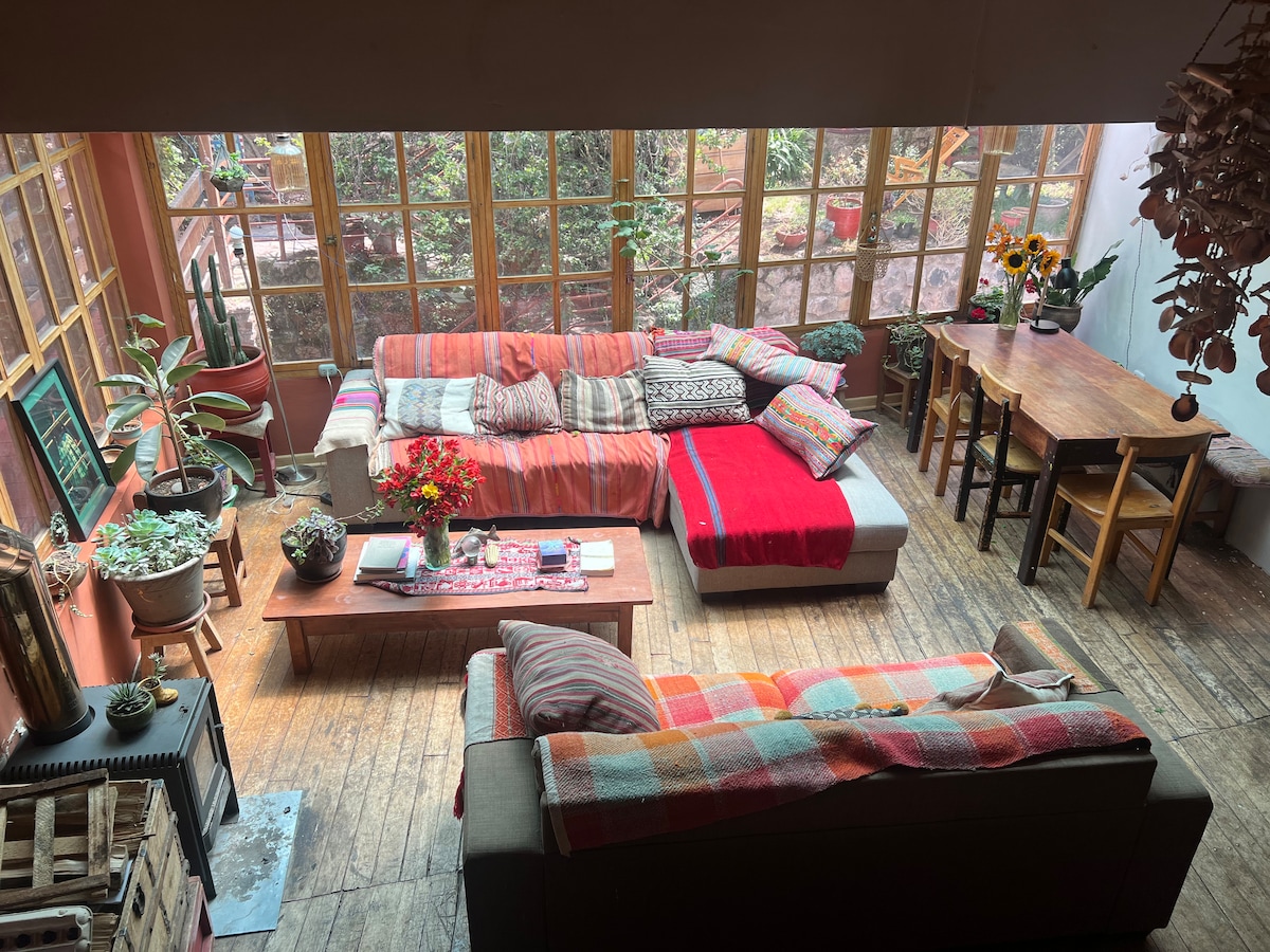 A tres cuadras de la plaza de Armas de Cusco, en el barrio tradicional de San Blas está el Mini departamento completamente privado y equipado con cocina, comedor,baño, dormitorio, chimenea, ventanal, neflix, wifi (fibra óptica) y una terraza en el jardín de la casa. Cuenta con servicios las 24 horas y goza de la paz del bosque localizado detrás del dormitorio principal. Forma parte de una casona tradicional de tipo colonial -Casita Azul-de adobe, paredes blancas con puertas y balcones azules