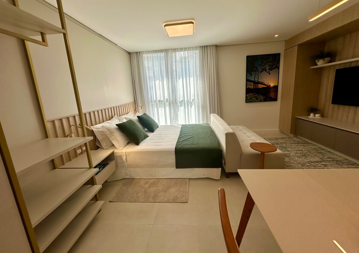 Studio novo, totalmente mobiliado e equipado, em um prédio inteligente com arquitetura única, localizado a apenas 100 metros da UFSC. Aqui você esquece as chaves: todos os acessos são por reconhecimento facial. Estrutura completa: 🚲 Bicicletário 💪 Academia 👔 Coworking/sala de reuniões 🍽 Sacada gourmet 🌿 Rooftop com gramado Viva com conforto, tecnologia e praticidade no coração de Florianópolis!
