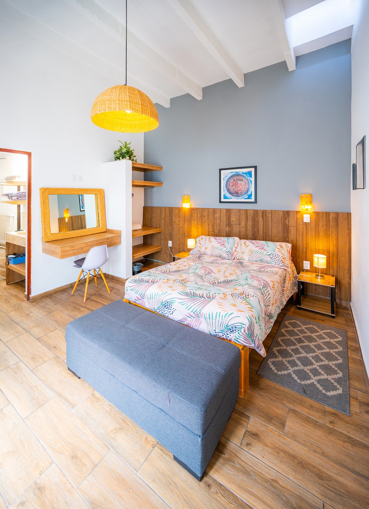La casa es un espacio cálido y fresco de arquitectura colonial, cuenta con una habitación con baño privado, cocina, sala y comedor. Durante el día se encuentra en calma y en la noche se llena de vida. La entrada es independiente. The apartment is a fresh space with colonial architecture, it has a bedroom with a private bathroom, living and dining room. During the day it's calm and at night it comes to life.