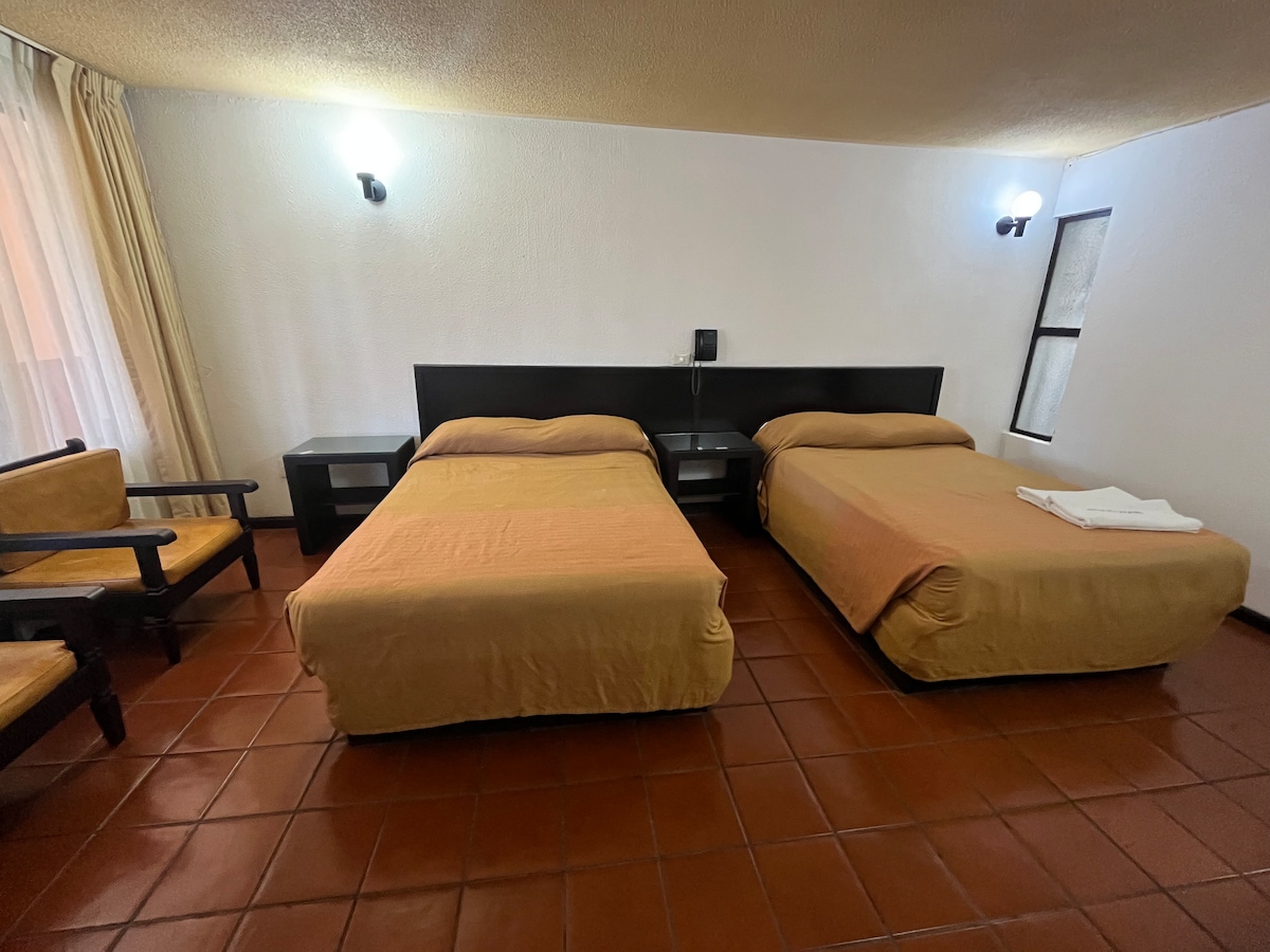 Habitación amueblada con 2 camas Queen, smart tv, con vistas al patio interior, adaptada para personas con capacidades diferentes (sin escalones, barras de apoyo en wc, banco en regadera). Disfruta de una noche cómoda y acogedora en el centro de Morelia. A 50 pasos de la Av. Madero (avenida principal)