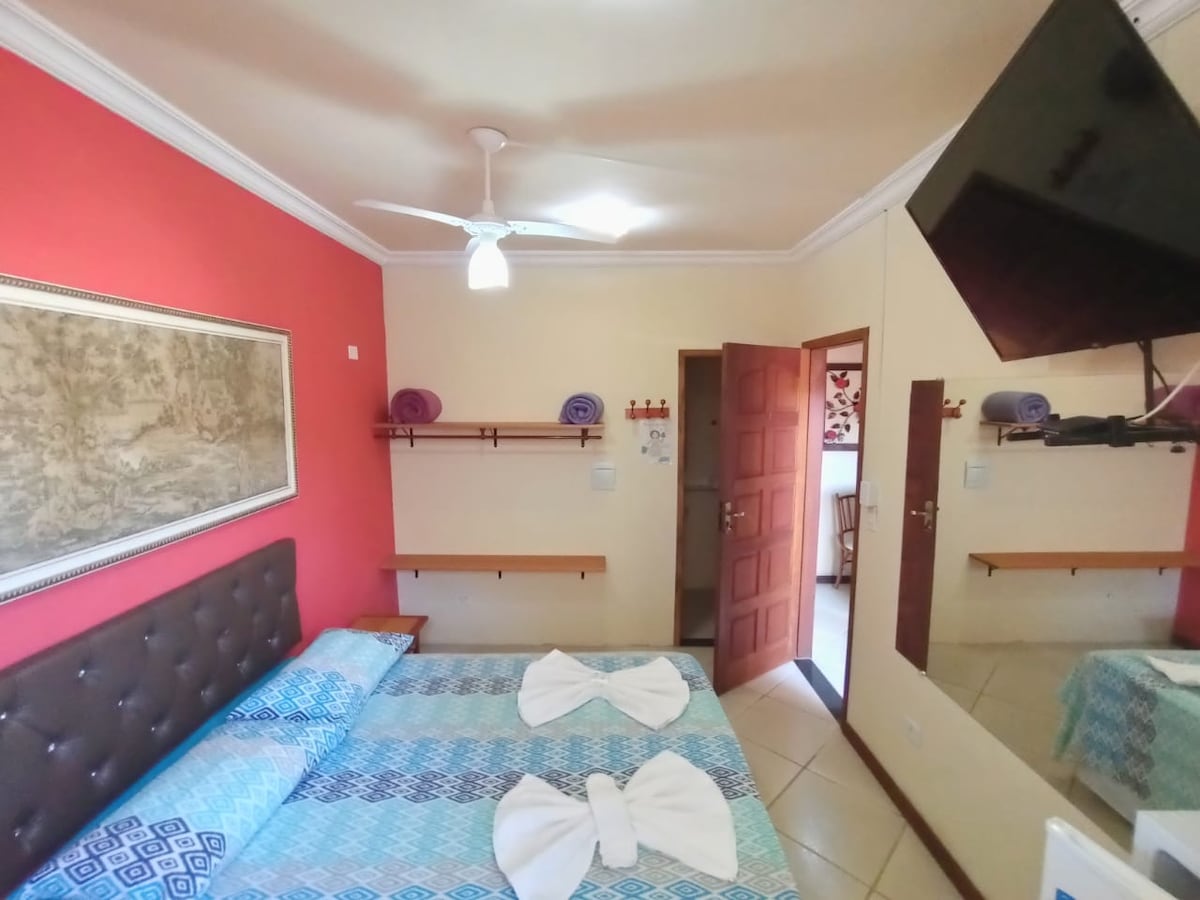 A suíte possui cama de casal com forro de elástico, uma manta fina, e travesseiros com fronhas. A suíte não possui vista direta para o mar mas você consegue ver o mar no nosso deck que fica de frente à praia. O Ar condicionado, ventilador, frigobar, TV e banheiro privativo estão disponíveis para seu conforto. Além disso, são fornecidas duas toalhas de banho. Esta suíte não fica localizada na parte próxima à praia ou deck e sim no primeiro ou segundo prédio no meio ou começo do quintal.