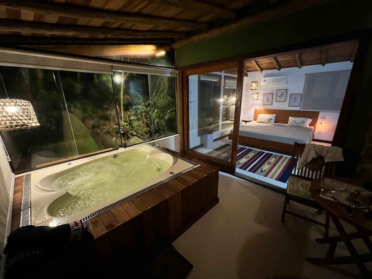 Chalé com Jacuzzi privativa em Paraty, um oásis zen, romântico e sofisticado em uma Villa exclusiva e charmosa, a apenas 600 metros do Centro Histórico e do mar. • Experiência única de birdwatching e observação dos macacos “saguis”🐒🦜 • Frutas nativas, jardim tropical exuberante e flores coloridas. Localizado à beira-rio, área nobre e segura, próximo às praias e Cais de Turismo, de onde partem barcos para ilhas paradisíacas. Desfrute da tranquila caminhada pelo calçadão cinematográfico.
