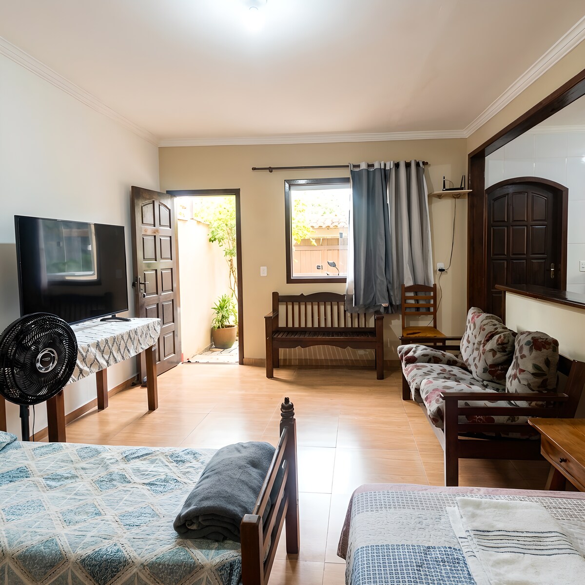 Uma Suíte muito bem localizada na cidade de Paraty, em um lugar tranquilo, bairro Portão de Ferro 2, com entrada independente, próxima ao supermercado Rede Market e Super Carlão, próximo a padaria, restaurante, farmácia, pizzaria, academia, ponto de ônibus e aeroporto. Ficamos a 5 minutos ( de carro) do centro histórico de Paraty e a 15 minutos caminhando. Suíte com cama de casal e roupas de cama, Ar condicionado, ventilador de teto, Frigobar, Chaleira eletrônica, Tv.