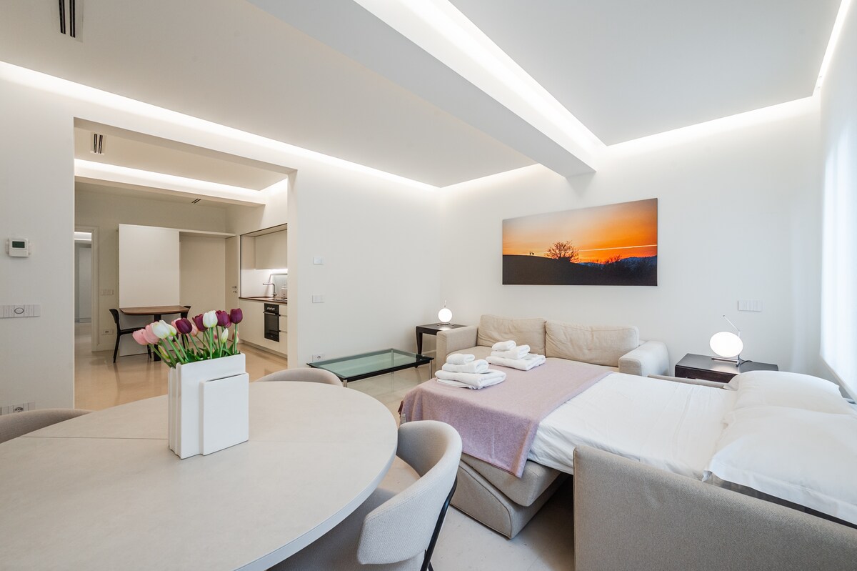 The accommodation with independent access from the garden, used by guests for outdoor breakfasts, consists of 2 rooms: the living area for preparing breakfast (no cooker) equipped with: fridge, electric oven, coffee machine, kettle, milk warmer, table and sofa; the large double bedroom (16 sqm) with exclusive bathroom. The sofa converts into a comfortable double bed in case of more guests. ATTENTION! NO kitchen, washing machine and TV, not suitable for long stays Possibility of outdoor parking.