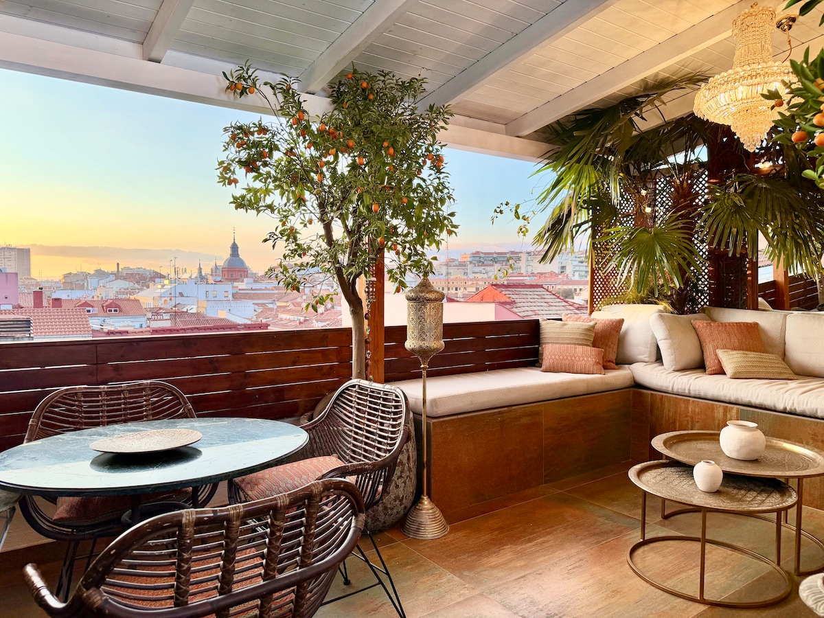 Disfruta de Madrid desde este espectacular ático en Canalejas, perfecto para dos personas. Relájate en su amplia terraza privada, equipada con mesa de comedor y sillas asoleadoras, ideal para desayunar al sol o cenar bajo las estrellas. El estudio es moderno y acogedor, con cama doble, cocina equipada, Wi-Fi y baño privado. A solo pasos de la Puerta del Sol y el Barrio de las Letras, estarás rodeado de cultura, gastronomía y vida nocturna. * Nota: Piso exclusivo para alquileres temporales