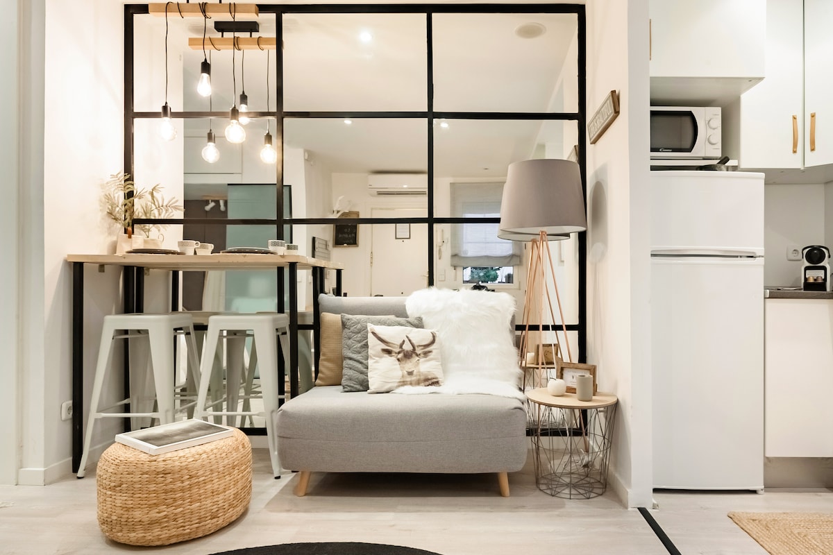 “Autumn” apartment is located in Madrid center, just off Gran Via, on a colorful, busy street in an authentic, quiet building. It is bohemian-inspired, cosy and modern open-space with windows, in the heart of lively restaurants, tapas and shops. It has WiFi and is fully equipped. Best for a single, a couple or couples with a kid! Pets are also invited happily! The apartment is located in an authentic quiet building. It is modern designed, themed to its name, Autumn, and consists of a bedroom with a double bed, a living area with a single pull-out sofa and a working table, kitchen with a dining table and bathroom. We took special care of all the little details, to make it the best stay for you! It has WiFi and is fully equipped, including a washing machine, TV, air conditioning, and Nespresso coffee maker - all just ready for your comfort and enjoyment! The apartment is a studio open space apartment - and it's all yours to enjoy! There are no areas in the apartment that you cannot use or access! We love hosting, but also respect our guests' privacy! We are here for you as much as you would like! The apartment is just off of Gran Vía, the most central street in Madrid, in a colorful neighborhood called Chueca. The area is famous for being a fun, bohemian area. In the street there are authentic cafes, tapas, restaurants, and a supermarket. The Central Metro Station Gran Via is a 2 minute walk from the apartment. From there you can take the metro to anywhere you want in Madrid and also to all the train stations that will take you out of Madrid to the rest of Spain. If you come by car, a big parking lot is located at Plaza de Pedro Zerolo, Madrid, just a 2 minute walk from the apartment. There is also a bicycle-rental station minutes away. A hosting kit of water, soda, milk, coffee, tea and sweetners will be waiting to welcome you :-)