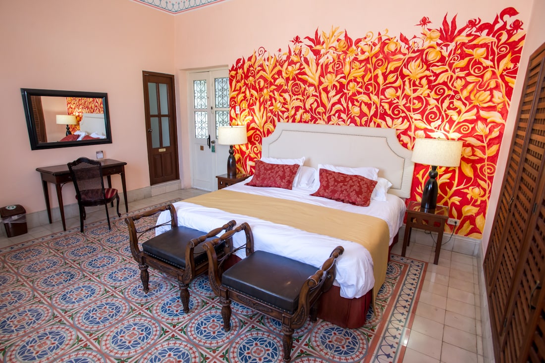 Lovely spacious room on ground floor with luxurious twin beds , imported sheets ,duvets. Very large bathroom with shower. This room opens onto a lush interior patio, has 18ft ceilings, hand painted walls, antique furniture and handmade pasta floors. The rate includes a gourmet breakfast , free wifi, ceiling fans, air conditioner and free mini bar that has purfied water, beer and refreshments. There is a shared plunge pool. Every night there is a free tequila tasting at sunset on the roof!