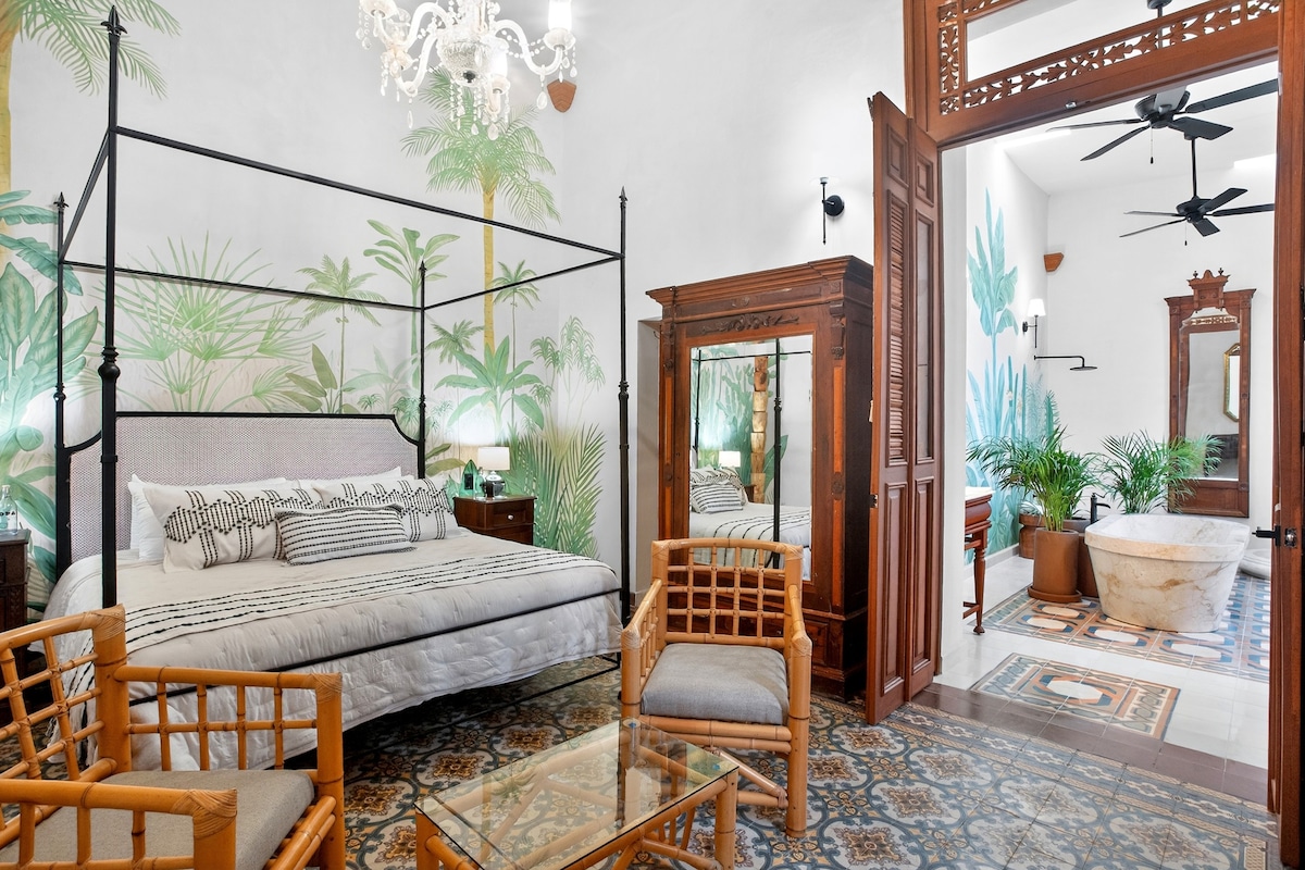 Historic two-bedroom villa located within walking distance of the most popular sites in the historic center of Merida. The villa boasts 18-ft ceilings, the original handmade pasta floors and antique furniture. The villa has a large patio with two chaise lounges overlooking a lush tropical garden. The Villa has a Gourmet Breakfast included daily and access to a plunge pool on the rooftop next door.