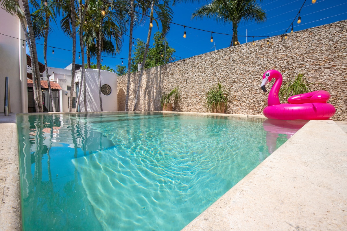 Spacious apartment inside colonial house, perfect for 2. Located east of downtown Mérida, near the ChemBech neighborhood, only a 20-minute walk from the main square. It welcomes travelers seeking calm and introspection. Unique in style and design, with luxury finishes, it guarantees privacy away from the hustle downtown. The apartment is completely private, on the lower level. It has a fully equipped kitchen and living room, a pool, a garden, a terrace, one king bedroom with a marble bathroom.