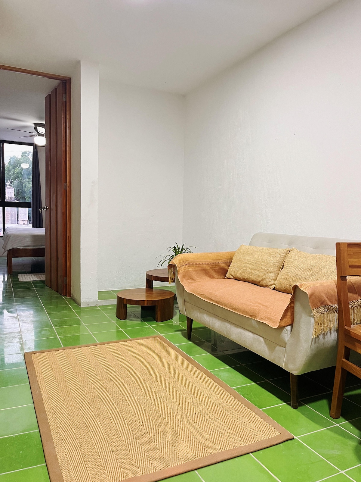 Cozy apartment in an excellent location, steps from Paseo Montejo, a tourist area of architecture and historical monuments, close to the Calle 47 gastronomic corridor, La Plancha Park, Paseo 60, the American Consulate, the ADO Bus Terminal, as well as numerous cafes, bars, restaurants, banks, and Walmart. This quiet and comfortable one-bedroom apartment is ideal for long or short stays, home office space, or relaxing. It also has a beautiful pool to cool off in after a city tour.