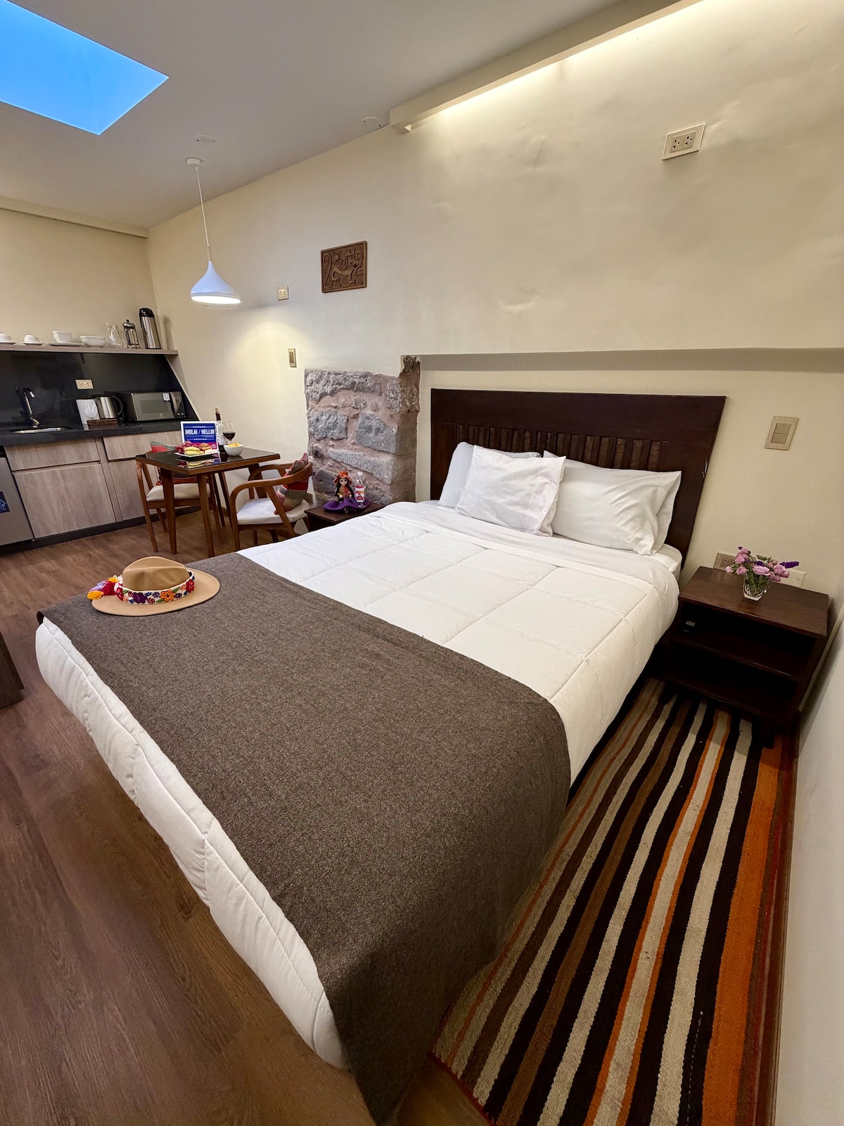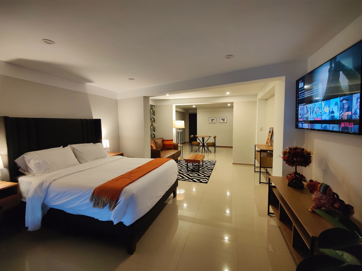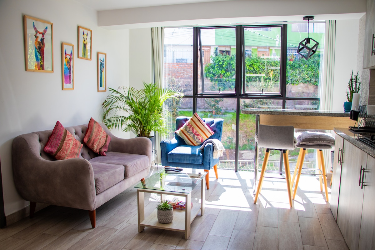 Moderno y confortable studio ubicado en una zona céntrica de Cusco, donde podrás encontrar muy cerca supermercados, restaurantes, farmacias, entidades bancarias y financieras, casas de cambio, clínicas de salud y otros, decoración moderna sencilla, funcional, acogedor y bien iluminado. Sala con Wifi, Netflix, Cable mágico, sofá confortables, kitchenette totalmente equipado, ducha con abundante agua caliente las 24 horas, terraza con sombrilla y vista panorámica de la ciudad.