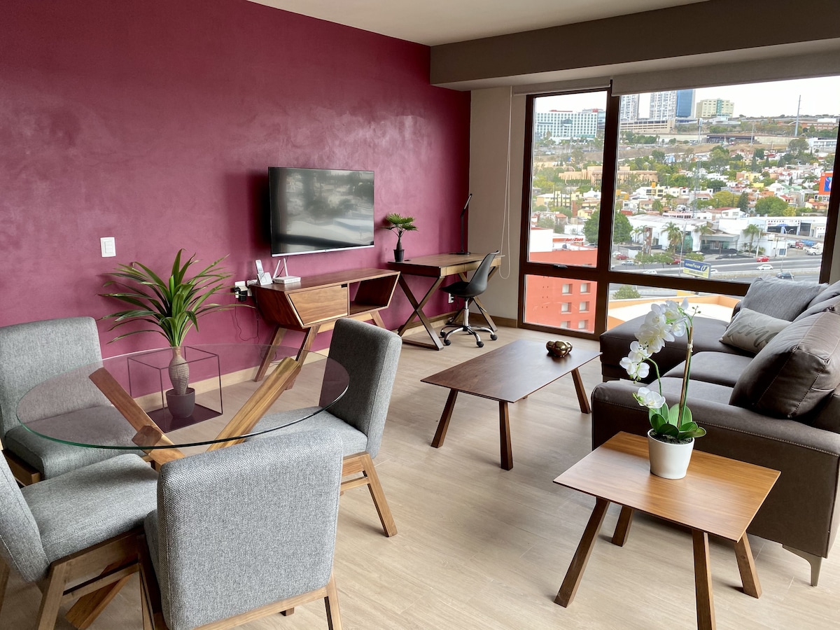 ¡Descubre las vistas más impresionantes de Querétaro! desde este moderno departamento de estilo industrial. A solo 10 minutos del centro, disfruta de increíbles panorámicas tanto de la ciudad como de la montaña. Perfecto para grupos de hasta 6 personas. Es ideal para viajes de trabajo o placer por el fácil acceso, comercios y la posibilidad de facturar tu estancia. Las habitaciones cuentan con aire acondicionado y calefacción. Experimenta la comodidad que este departamento te ofrece.