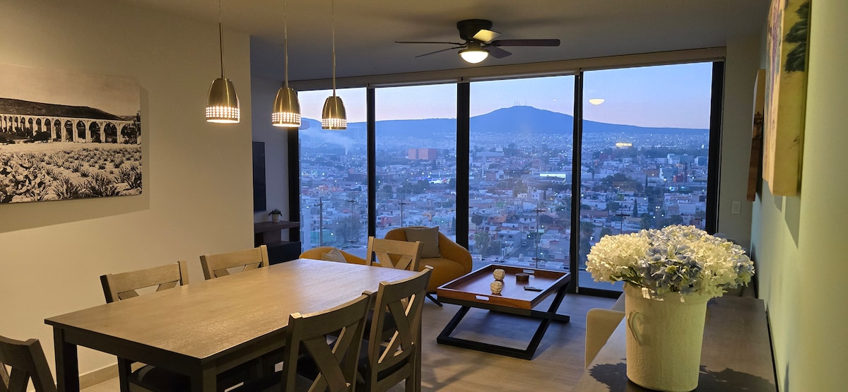 ¡Descubre las vistas más impresionantes de Querétaro! desde este moderno departamento de estilo industrial. A solo 10 minutos del centro, disfruta de increíbles panorámicas tanto de la ciudad como de la montaña. Perfecto para grupos de hasta 6 personas. Es ideal para viajes de trabajo o placer por el fácil acceso, comercios y la posibilidad de facturar tu estancia. Las habitaciones cuentan con aire acondicionado y calefacción. Experimenta la comodidad que este departamento te ofrece.