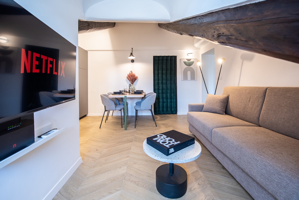 Located in one of the most beautiful streets of the historic center of Turin, rich in handicraft and traditional local shops, the apartment, within less than a minute walk from Piazza Castello, is located on the third floor of a building of 1700, with common areas recently and completely renovated. Quiet and comfortable, it is suitable for individual travelers or couples, and it is elegantly furnished with utmost attention to detail.