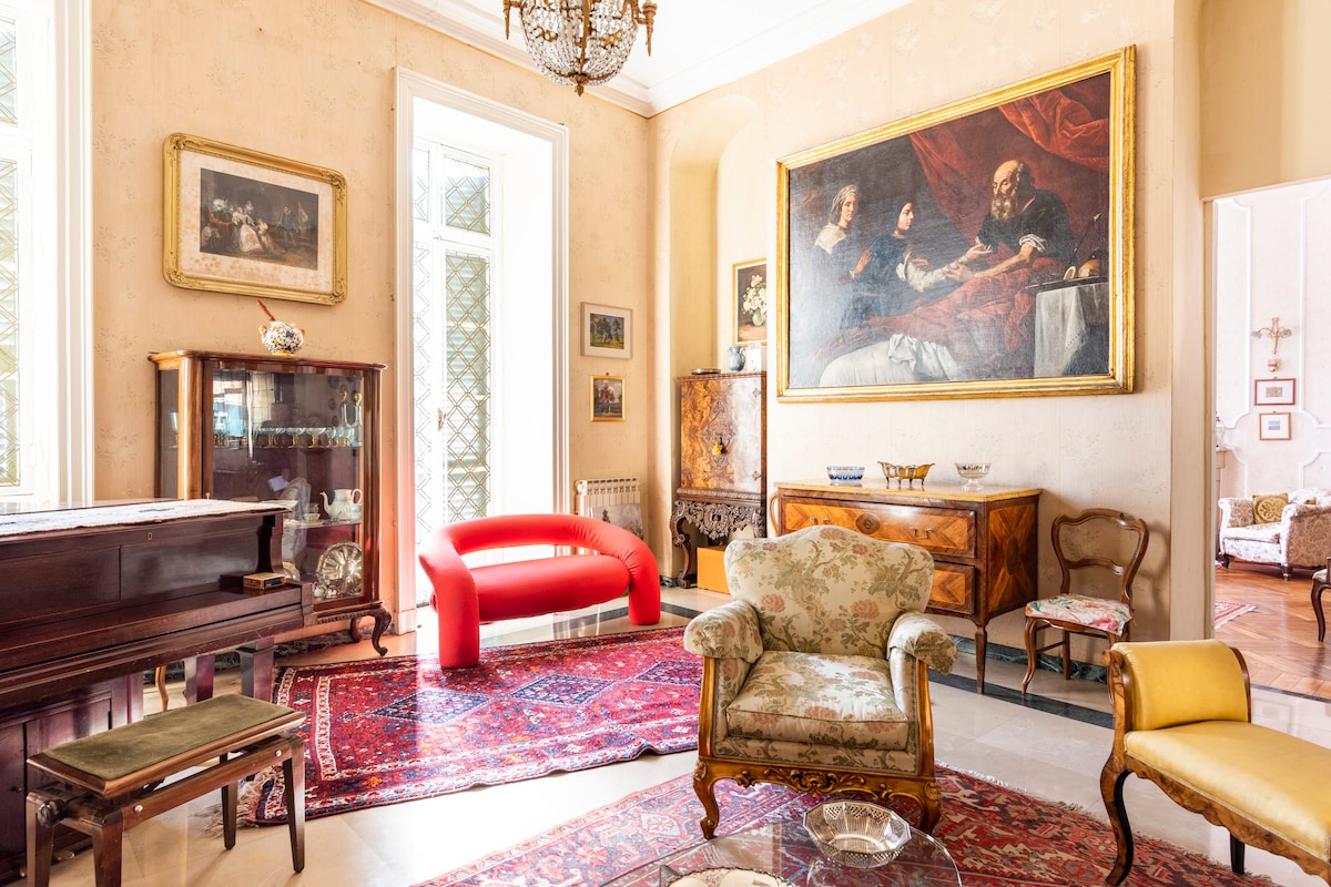 Sit at the piano next to a fireplace in a majestic hall with high ceilings with exposed beams, historic floors and doors, many touches of color and contemporary design. In 100sqm there are also a small kitchen, two bedrooms, two bathrooms, and a walk-in closet. Just out of the building you are in Piazza San Carlo, the most important square in the city. The windows of the master bedroom overlook the Egyptian museum. The courtyard of the building is shared with the most prestigious brands shops such as Prada and Chanel. You can't find such a prestigious location better placed to explore Torino. Maria Vittoria Due was our lovely house for several years. High original wooden celing of the XVIII century, the fine furniture and materials makes it unique. Hope you'll love that place as I and my husband did. Our guests will have access to the all apartment. There are two double rooms each one with its own bathroom and a sofa-bed for two in the living room, a walk-in closet, a small kitchen and a big living room. There is a washing-machine, a dishes-machine and the stuff to hang and iron your clothes. We'll provide you fresh bed-sheets and 3 different size bath towels for each guest. The kitchen is well equipped for every needing. If you have babies just ask us and we'll let you the necessary for his sleeping, eating and changing. We'll do our best to help guests in case of any necessity. The house is in the heart of the city, across from the Egyptian Museum and next to Piazza San Carlo. Easily walk to the Royal Palace, Renaissance Museum, Natural Science Museum, and Vittorio Emanuele Square. Many kinds of restaurants are nearby. Just at ten minutes walk far away from the main train and metro station (Porta Nuova). Next to the main entrance there is a bus stop to travel around the city center. A couple minutes walking there's a bus stop to go around the all city and outside. In San Carlo Square, right next to the house, there's a big car parking.