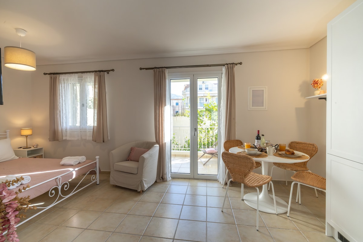 Bright and spacious, this lovely one bedroom apartment is located on a quiet street, a few meters from the Central Square of Argostoli. Beautifully decorated in a soft palette, this is the perfect choice for couples or a family of three, who want to enjoy their holidays in a beautiful environment in the heart of the town. It features a balcony and all the conveniencies that guarrantee a pleasant stay: A/C, fully equipped kitchen, double bed, folding single bed for 3rd person, washing machine etc