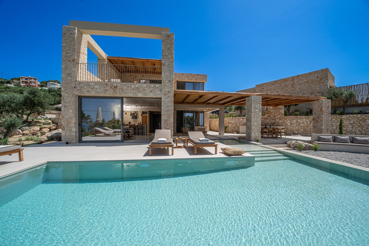 A newly built house opens its doors this year, for the first time to welcome even the most demanding guests. The privacy offered by the villa along with the architecture that matches the modern with the minimal decoration, in combination with the comfortable spaces and the impressive facade overlooking the endless blue of the Ionian Sea, make it a cozy and enchanting place! Enjoy your stay in this relaxing and elegant space!