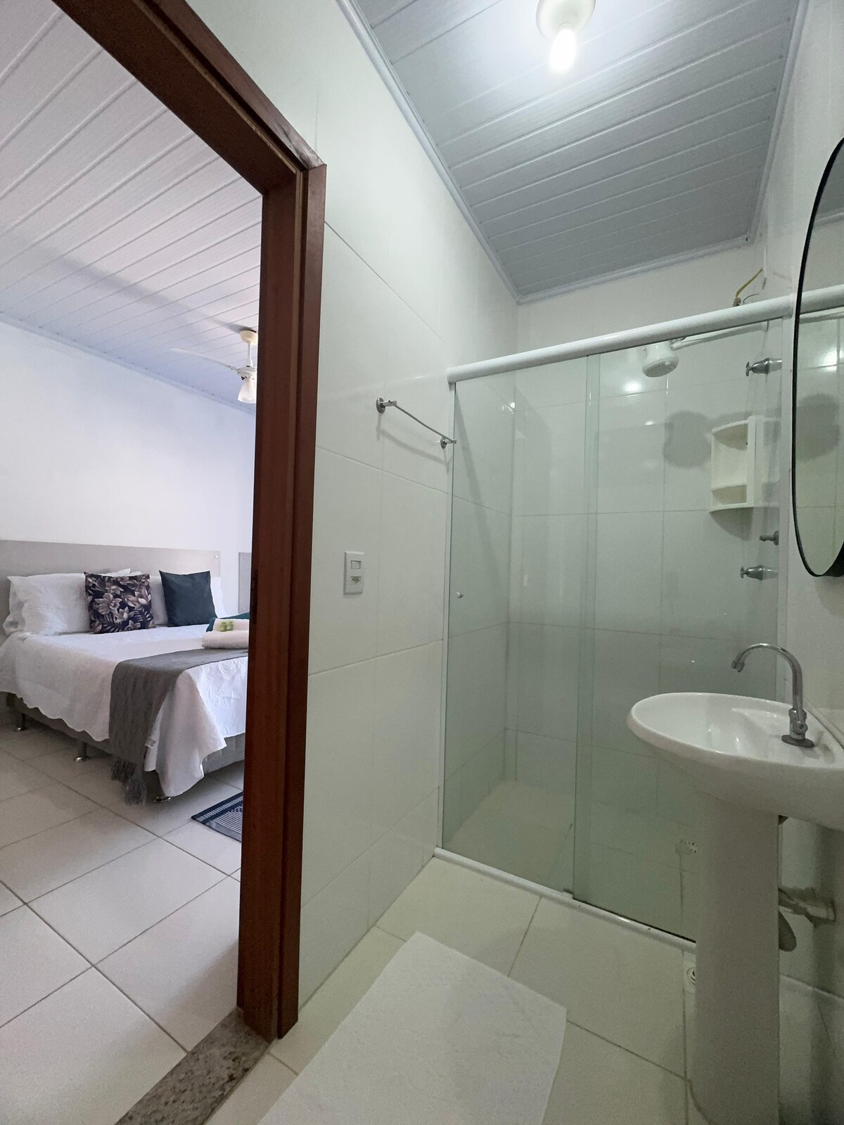 A suíte possui cama de casal com forro de elástico, uma manta fina, e travesseiros com fronhas. A suíte não possui vista direta para o mar mas você consegue ver o mar no nosso deck de madeira que fica de frente à praia. O Ar condicionado, ventilador, frigobar, TV e banheiro privativo estão disponíveis para seu conforto. Além disso, são fornecidas duas toalhas de banho.