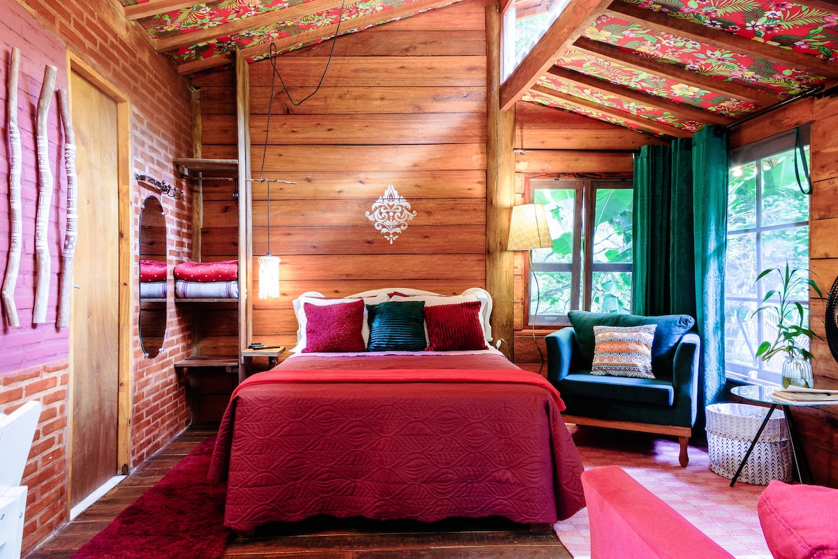 This brand new house sits high above the trees inside the Aldeia Rizoma eco village, a gated property 15 minutes away from the city historical center. The property offers a jungle gym, sauna (paid as an extra), private trails and access to 5 private waterfalls. The one bedroom studio has a king size bed built high so you can watch the forrest from it. It offers a private hot tube and a fully equipped kitchen. There is an extra bed that can be used for a third person with an extra fee per night
