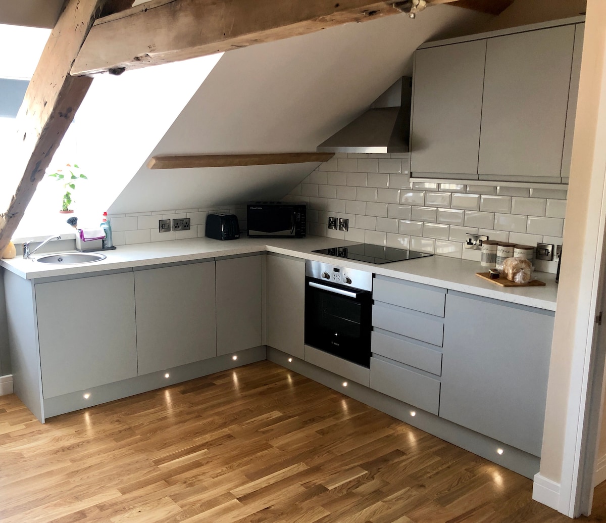 A light and spacious, fully contained open plan apartment with separate walk in shower and WC. Kitchen and dining/breakfast bar with small lounge seating area and tv. Entirely your own private space near quiet friendly seaside town. Private parking with steps to access entrance into the building, situated over owners double garage. Outside table, and chairs. Key safe entrance into apartment. Bedroom with luxurious double size bed, bedside drawer units, and large fitted wardrobe and wall mirror.