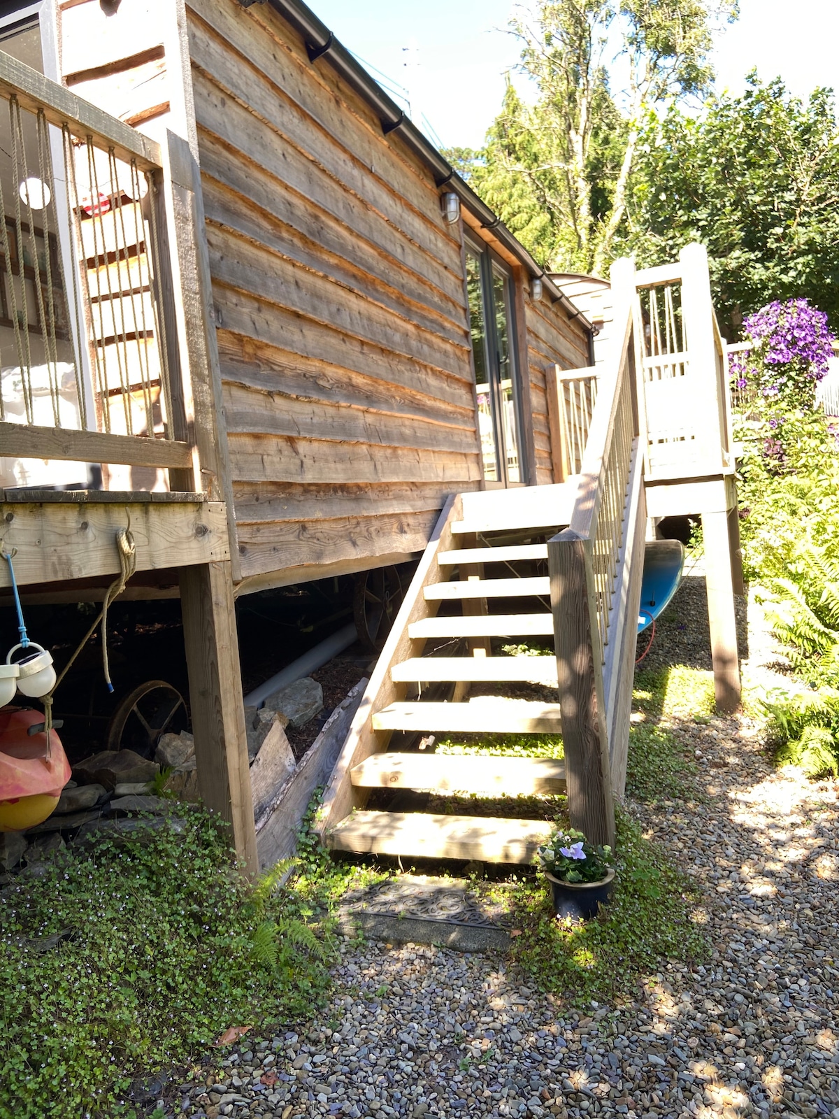 Chalet style open space studio is a new addition to our 4 accer smallholding, tucked down a quiet lane just a couple of minutes drive from Cardigan. Golygfa, meaning ‘nice view’ is a name of our home that is on top of a little hill overlooking the Teifi gorge. Stunning views towards the Preseli hills, just a stones throw from Poppit, Mwnt and Aberporth beach.