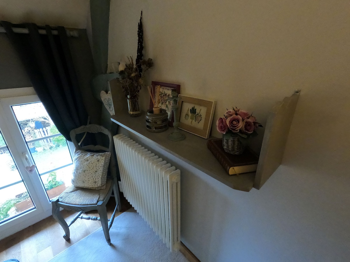 Cette suite de 45m2 totalement privative est composée d’une chambre avec terrasse réservée à nos voyageurs, d’une salle de douche très tendance et d’une belle pièce à vivre avec vue sur le jardin. Le lit est un lit 140×190 pour 2 personnes Un lit d’appoint (à l’étage ) est à demander et facturé 25€. Un panier « petit déjeuner » avec pain frais et confitures vous sera déposé chaque matin. Le village offre toutes les commodités et invite au tourisme régional. !! Pas de kitchenette !!