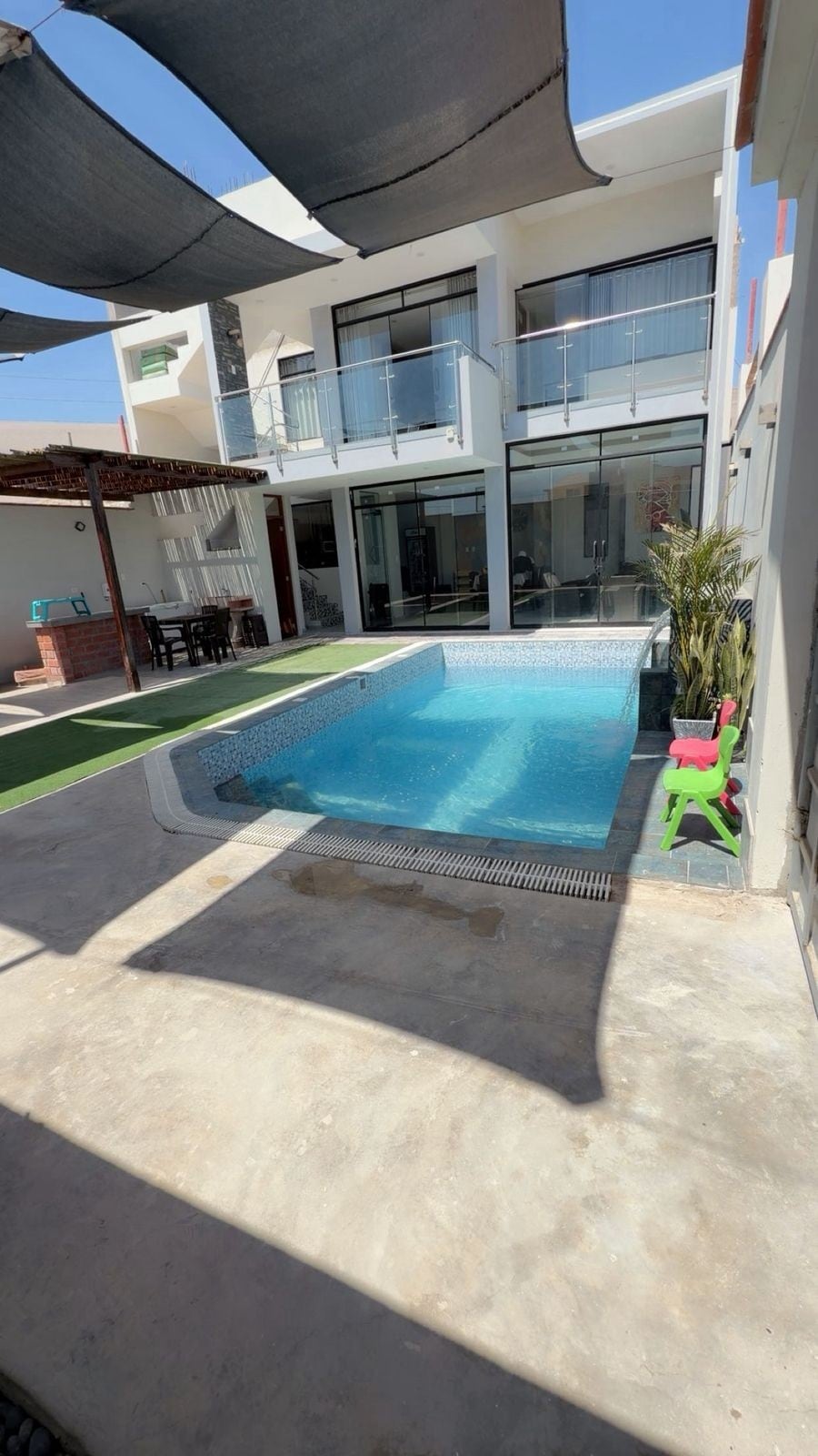 Linda y amplia Casa de Playa en Alquiler Estreno, ubicada en Cerrillos - I, frente al Parque Acuático de Camaná y a dos cuadras del mar. En el primer piso una espaciosa sala, comedor, cocina con isla, baño de visita, patio, lavandería, 2 habitaciones con baño propio y una habitación de servicio. En el segundo piso, 2 habitaciones con baño propio, terraza con parrilla, piscina y un baño completo. Es apropiada para recibir hasta 15 personas, totalmente amoblada y equipada. Cuenta con 3 cocheras.