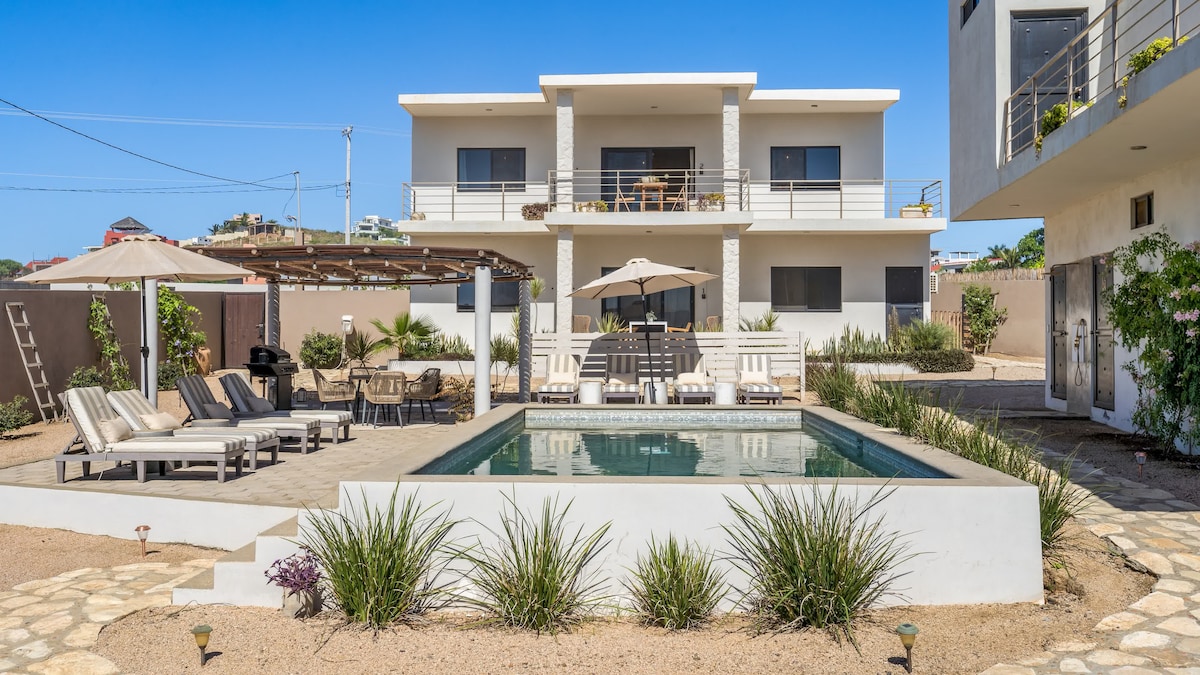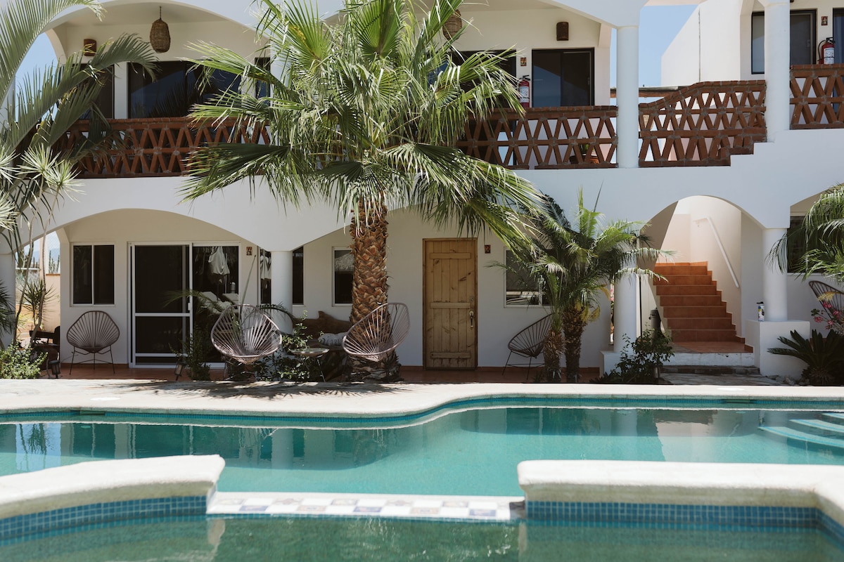 Welcome to Villas del Scarlet Cardones! Retreat to our peaceful downstairs condo in the heart of Cerritos. This is the only swim-able beach north of Cabo on the Pacific! Take in the ocean views and amazing Sierra de la Laguna mountain range from the property on your very own rooftop balcony. The condo is a 2 minute walk from the beach, restaurants and bars. We're located around 1 hr from Cabo and only 7 kilometers from Todos Santos. A/C, Pool, Hot Tub, Outdoor Grill Area, & WIFI!