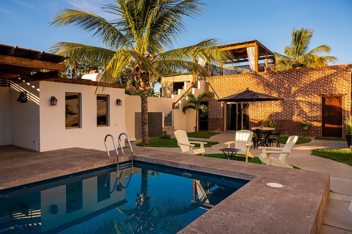 100 paces from the best beach on the Baja, surf's up, you got 3 surfboards, boogie boards, rooftop palapa, 2 hammocks, outdoor bbq with sink and fridge. Pool, some cool bars within walking distance & Todos Santos 5 mile up the road. 3 couches on the rooftop , outside dinner table. Smart tv/wifi, king size bed/private bath suite, 2 double beds in the 2nd bedroom & another bathroom. Water cooler & fresh water waiting for the french press or coffee maker. Pickleball next door!