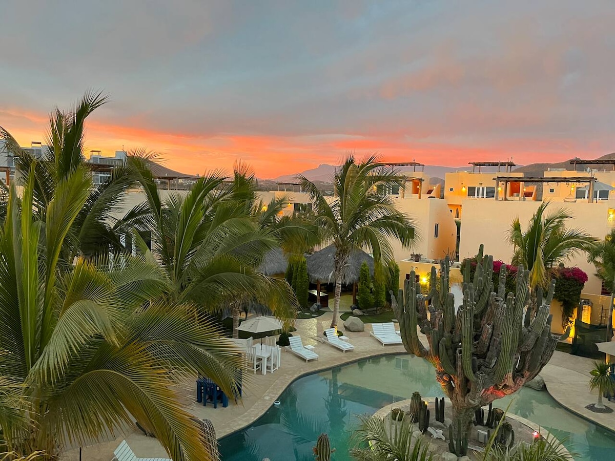 Curious to know what all the talk is about Cerritos? Let this 1 bedroom casa be your home away from home while you discover all that Cerritos has to offer! Relax in the onsite pool & 2 hot tubs or take a short 7 min walk to the beach for great swimming & surfing. The spacious & bright home has a queen bed in the bedroom with additional queen bed in the living space. The fully stocked kitchen is outdoors under an authentic palapa roof. Enjoy a margarita or two on the rooftop patio!
