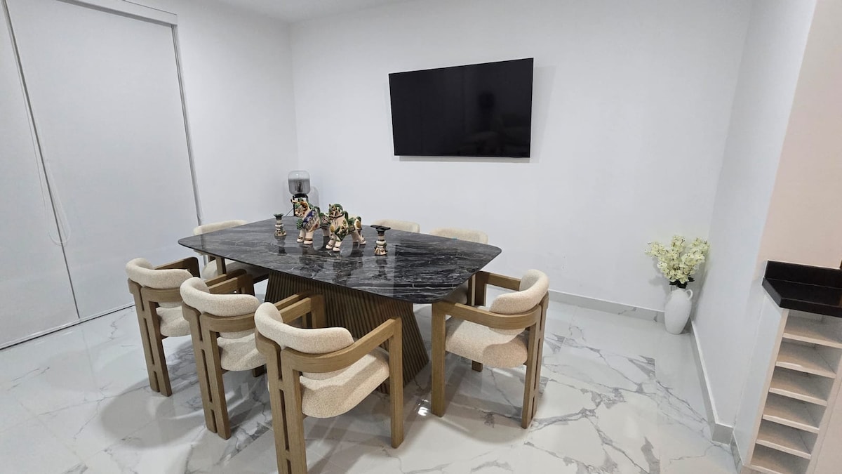 Departamento de 190 metros cuadrados, segundo piso primer piso es el lobby, totalmente equipado y super seguro; El departamento está frente al mar con una bella vista.; también tiene a su disposición: Wifi y direct tv Jacuzzi con vista al mar Piscina para adultos y niños Cancha de tennis y frontón Zona de golf Cancha de fútbol 5v5 Area de parrilla y fogata Área de juegos para niños Restaurante y bar solo en temporada de verano. Sin sabanas, solo cubrecamas y almohadas.