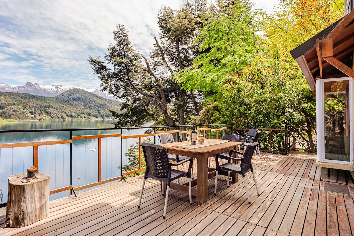 Cálida cabaña de estilo rústico a orillas del lago Nahuel Huapi con hidromasaje, hogar a leña, y deck. Monoambiente creado para el relax y el romanticismo con vista al amanecer y salida de la luna sobre el lago. Smart TV e internet por FIBRA OPTICA con wifi para trabajar. Una kitchinette con todo lo necesario, incluyendo cafetera dolce gusto. Caja de seguridad para resguardar tus notebooks al ir de paseo. Baño completo. Pool, ping-pong. Playa: Kayak y standup paddle. Desayuno continental.