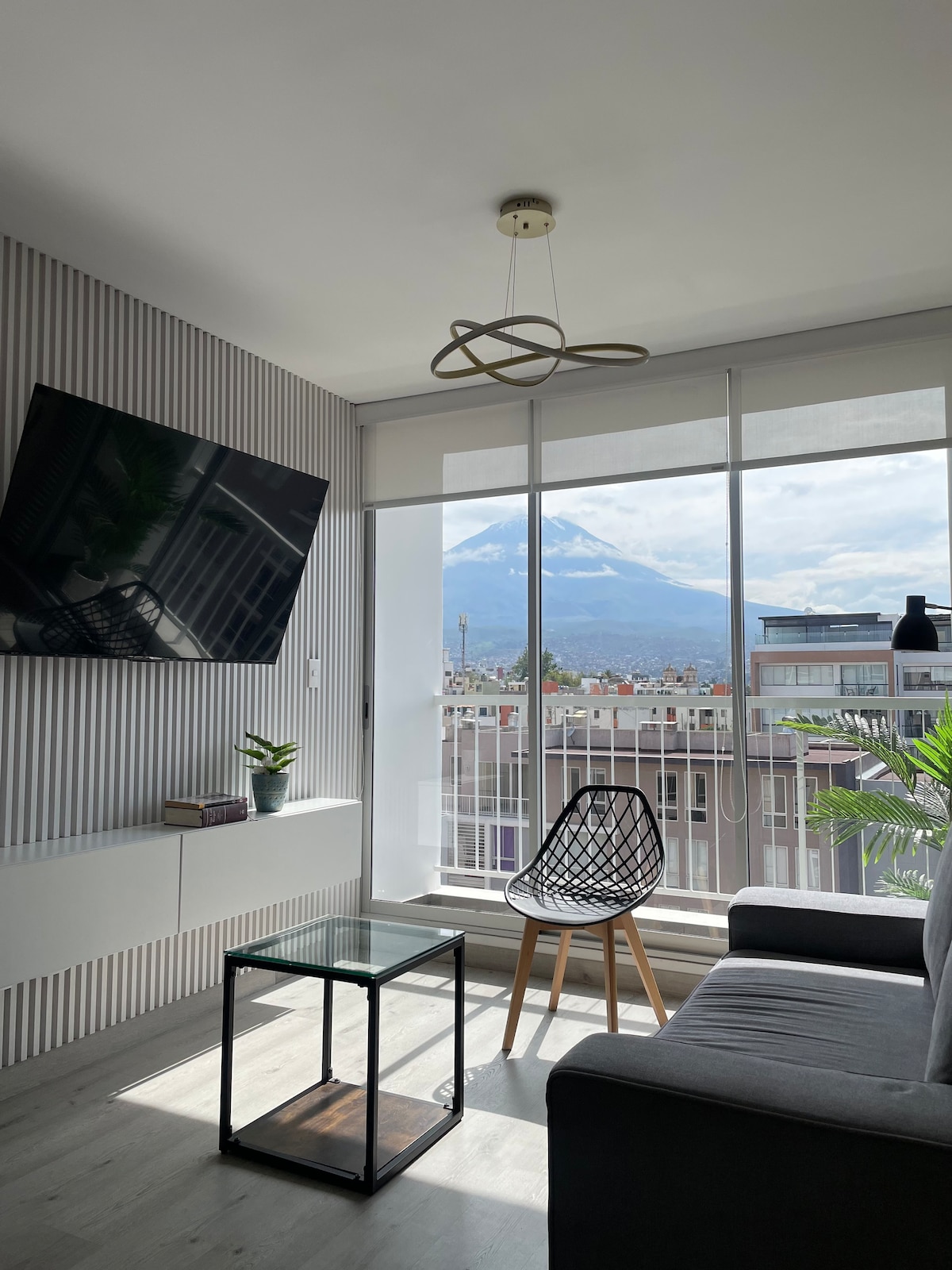 Moderno y acogedor departamento en el 8.º piso, con una linda vista desde el balcón. Ideal para hasta 3 personas, con 1 dormitorio, cocina abierta, mini sala, baño y lavandería. Totalmente equipado para una estadía sin preocupaciones. Ubicado en pleno centro, cerca de clínicas, universidades y avenidas principales. El edificio cuenta con ascensores, gimnasio y áreas comunes. ¡Tu base perfecta para explorar la ciudad blanca!.