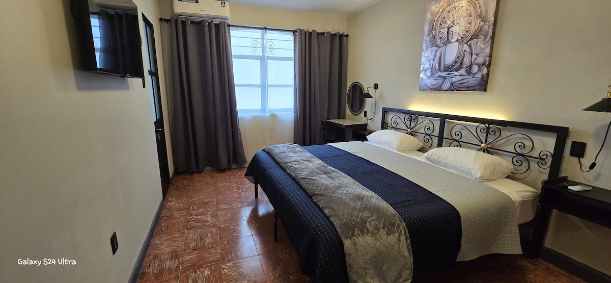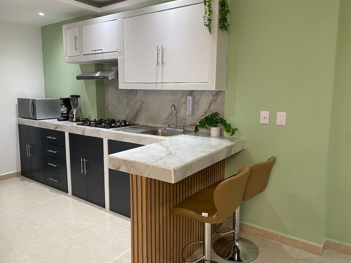 Disfruta de la calidez de este alojamiento tranquilo y céntrico.Contamos con una recamara con cama matrimonial, aire acondicionado y TV, sala-comedor con cocina equipada (refrigerador y estufa) y estacionamiento para un auto mediano. Nos ubicamos a 5 minutos caminando de los atractivos turísticos del centro. (paseo colón,paseo del Rio,alameda, teleférico) Hospedate en una de las zonas más tranquilas y seguras en Orizaba en donde pasarás una tarde agradable con la hermosa vista al teleférico.