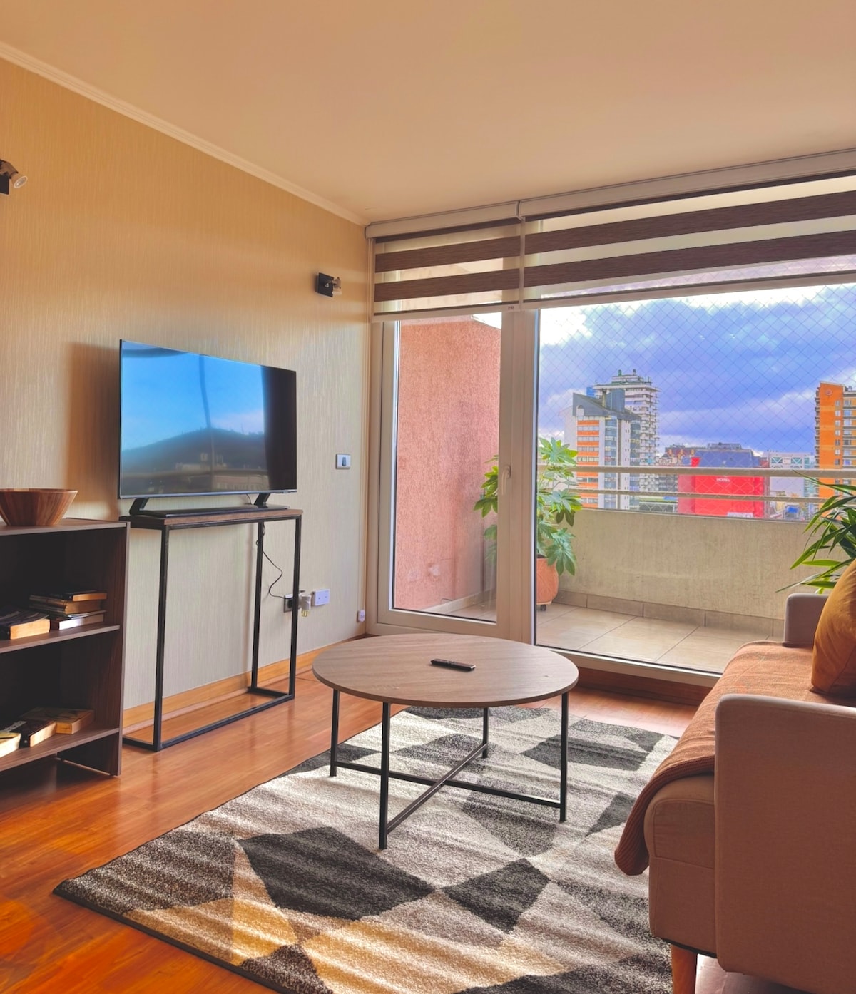 Disfruta de una estadía cómoda y moderna en este luminoso departamento full equipado, con una hermosa vista despejada a la ciudad. Ideal tanto para viajes de descanso como de trabajo. Ubicado a pasos del centro de Temuco, cuenta con wifi de alta velocidad (600 Mb), Smart TV con Netflix y HBO Max activos, y una cómoda cama premium que garantiza un descanso reparador. El edificio ofrece lavandería, conserjería 24/7 y estacionamiento privado gratuito.
