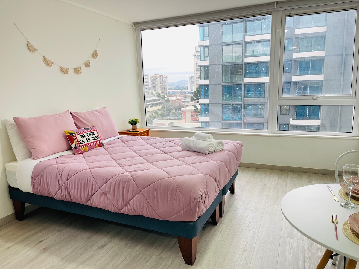 Disfruta tu estadía en un moderno departamento tipo estudio en pleno Temuco. A pasos de Av. Alemania, rodeado de cafés, bares, mall Portal, clínicas, universidades y Casino Dreams. Diseñado exclusivamente para dos personas, cuenta con cocina equipada, WiFi ideal para Home Office, baño privado y balcón. Estacionamiento frente a conserjería, sujeto a disponibilidad. Acceso controlado 24/7, cercanía, confort y estilo. ¡Te esperamos!
