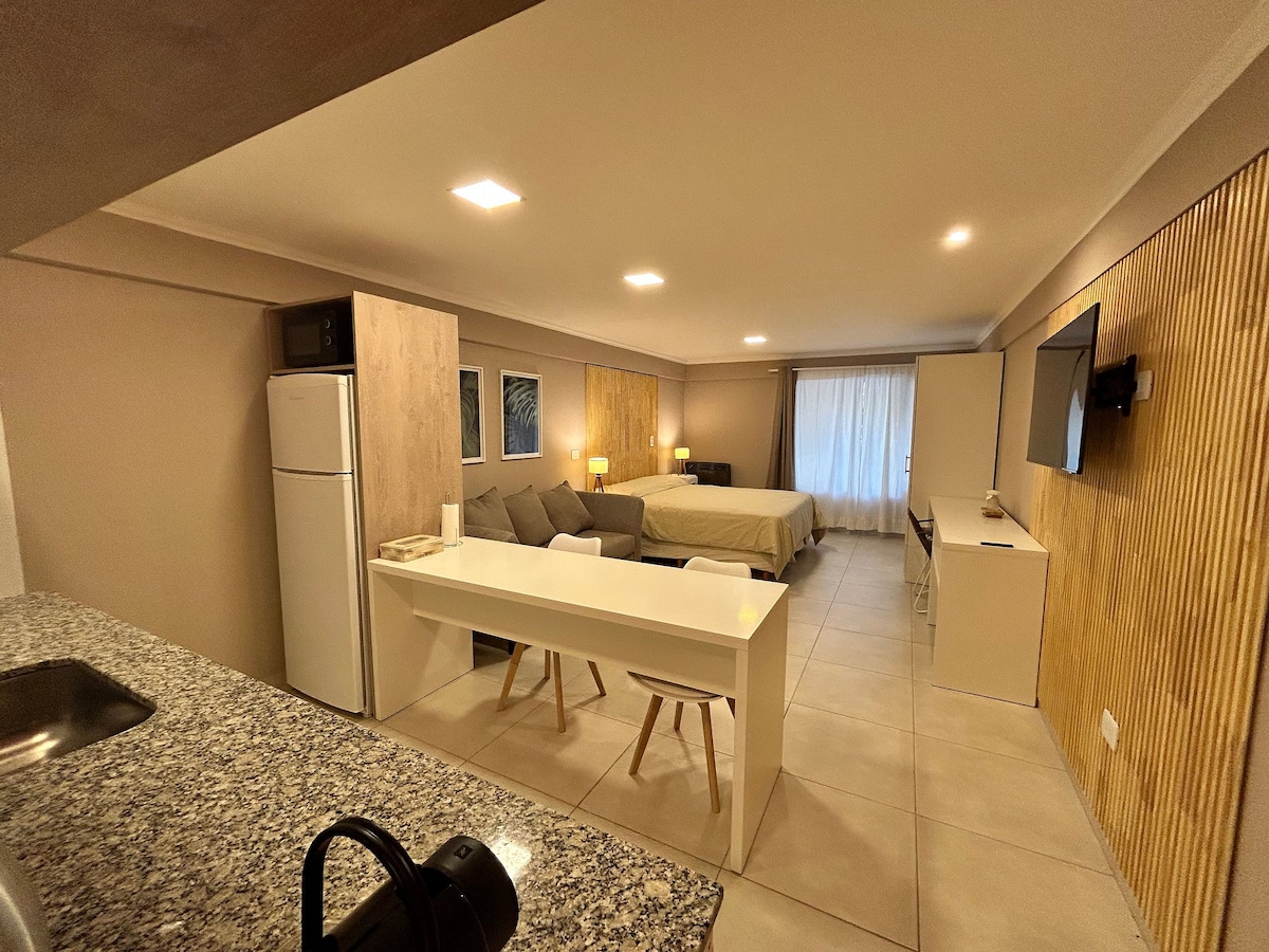 Estúdio moderno e novo, ideal para até 2 pessoas, projetado para oferecer conforto, funcionalidade e estilo. O ambiente integra TV grande, sofá confortável e cozinha completa, totalmente equipada para uma estadia prática. Conta ainda com mesa de trabalho, perfeita para home office. Localizado no térreo e no centro, combina design contemporâneo, comodidade e uma localização privilegiada.