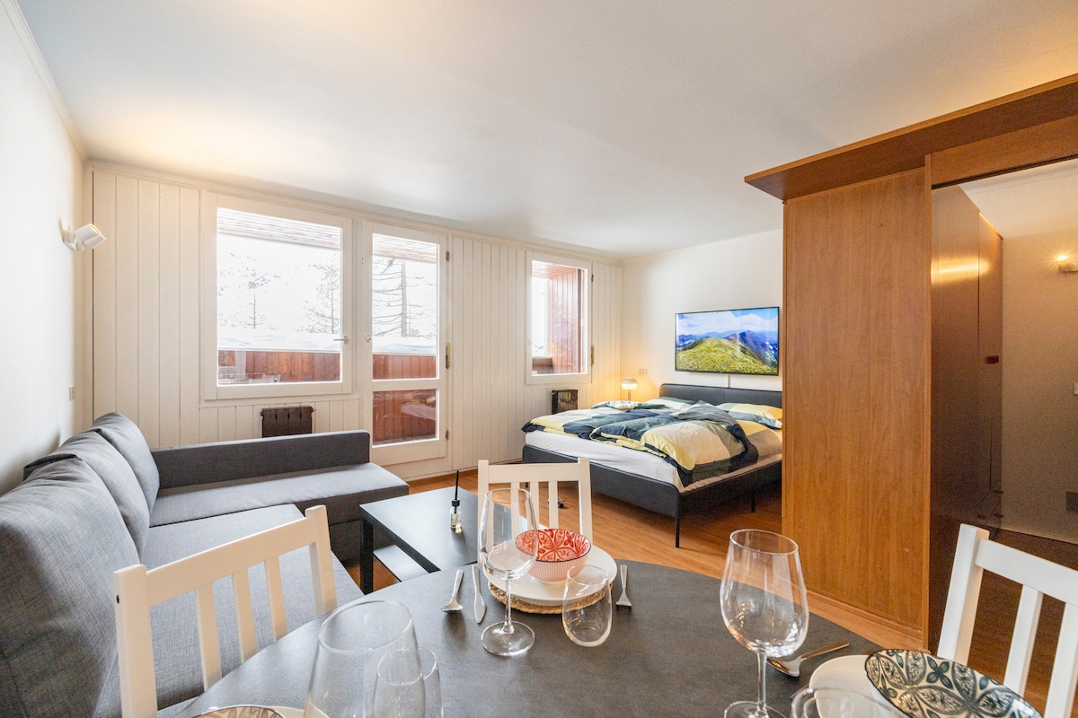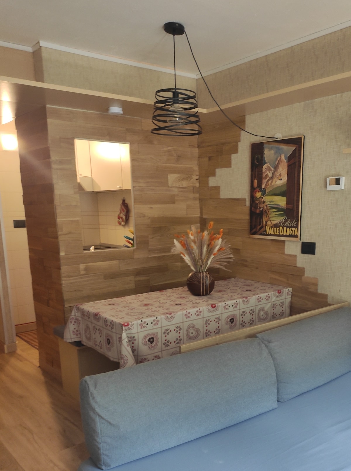 Charming apartment on the ski slopes of Cervinia with a VIEW ON MATTERHORN,free wi fi. The studio is ideal for two people but it can accommodate up to four thanks to a double sofa bed and a bunk bed. Residential context, living area renovated on 2014