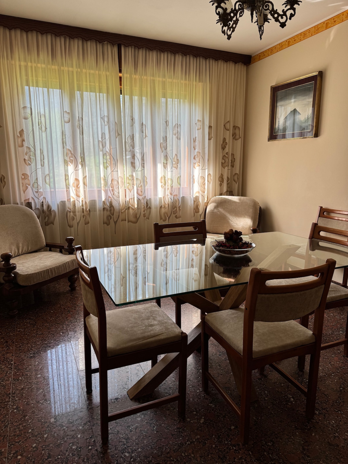 In the historic center of Aosta, in absolute tranquility, with views of the greenery surrounding the Roman walls and the massif of the Grand Combin, the accommodation is located on the first floor of a building of the Twenties, known as Villa del Sole.